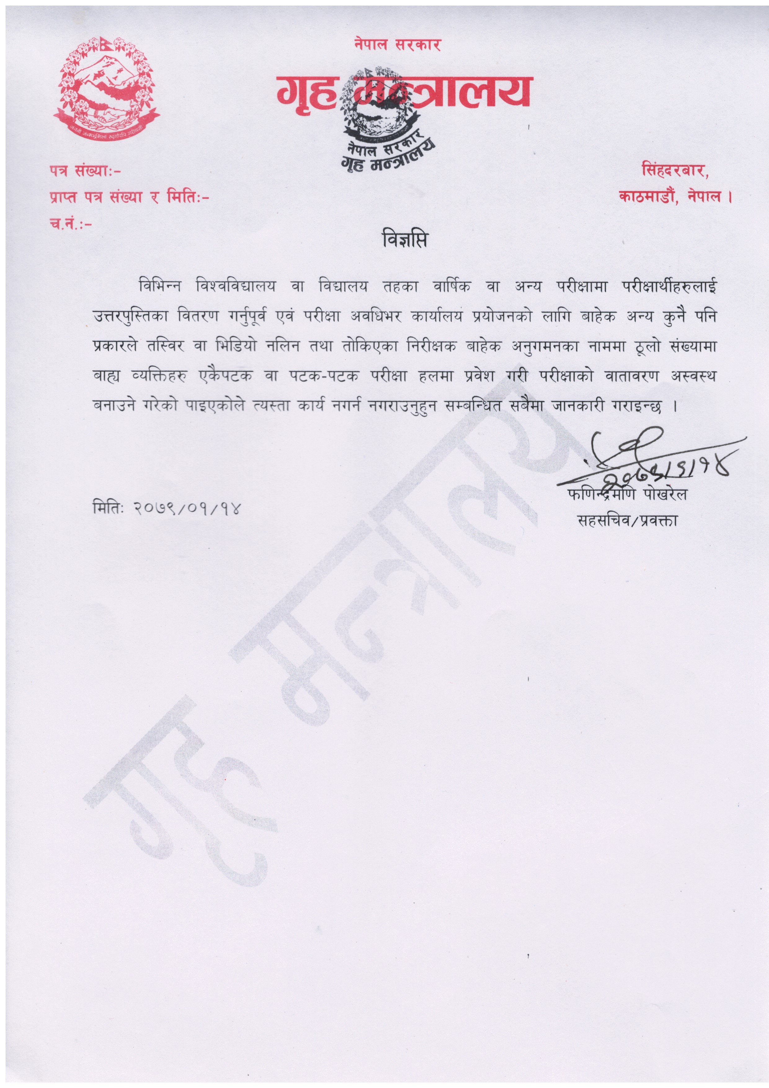 गृह मन्त्रालयले अनुगमनको नाममा परीक्षा हलमा पटक/पटक प्रवेश नगर्न र फोटो/ भिडिओ नखिच्न अनुरोध गरेको छ।