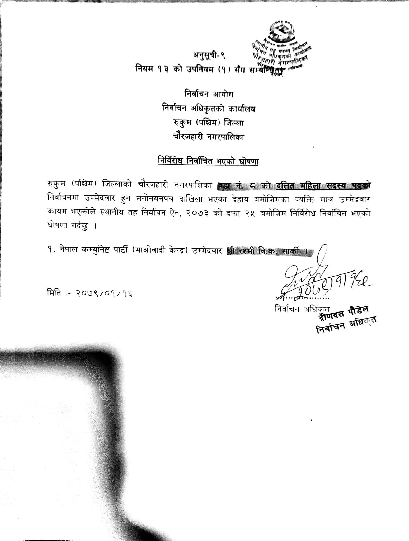 स्थानीय तह निर्वाचन २०७३ को दफा २५ बमोजिम उहाँलाई निर्विरोध निर्वाचित भएको घोषणा गरिएको निर्वाचन अधिकृत पौडेलेले जनाउनुभयो ।