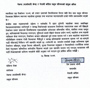 नेपाली कांग्रेसका जिल्ला सभापति प्रेमप्रकाश ओली र नेकपा माओवादी केन्द्रका जिल्ला संयोजक गोविन्द रोकाले संयुक्त विज्ञप्ति जारी गरी निर्वाचन आचारसंहिताको पूर्ण पालना गर्न र झडप रोकेर जिल्लाभर मैत्रीपूर्ण र स्वच्छ प्रतिस्पर्धाको वातावरण सिजर्ना गर्ने सहमति भएको जनाएका हुन् ।