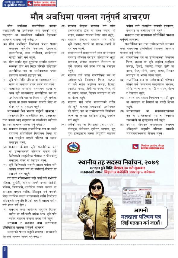 बैशाख ३० गते हुने स्थानीय तहको निर्वाचनका लागि निर्वाचन आयोगले मौन अवधिको पूर्ण पालना गर्न आग्रह गरेको छ ।