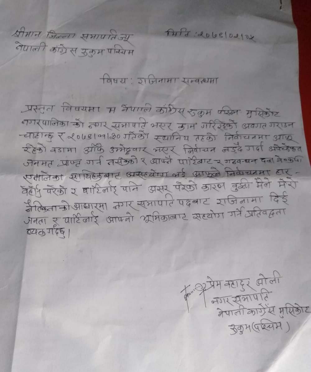 मुसिकोट । नेपाली काँग्रेस मुसिकोट नगर कार्यसमिति रुकुम पश्चिमका सभापति प्रेमबहादुर ओलीले पदबाट राजिनामा दिनुभएको छ । बिहिबार नेपाली काँग्रेस रुकुम पश्चिमका जिल्ला सभापतिलाई सम्बोधन गर्दै ओलीले पदबाट राजिनामा दिनुभएको छ ।