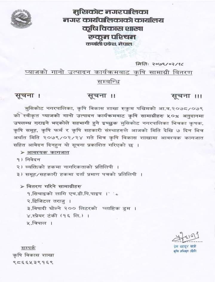 मुसिकोट नगरपालिका नगर कृषि विकास शाखाबाट नगरपालिका भित्रका कृषकहरुलाई ५० प्रतिशत अनुदानमा विभिन्न कृषि सामग्रिहरु वितरण गरिने जनाइएको छ ।