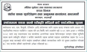 ‘कसैले जबर्जस्ती सडक खनेको पाइए सडक ऐन २०३१ अनुसार कारबाही गरिने जानकारी गराइन्छ,’ विभागले भनेको छ।
