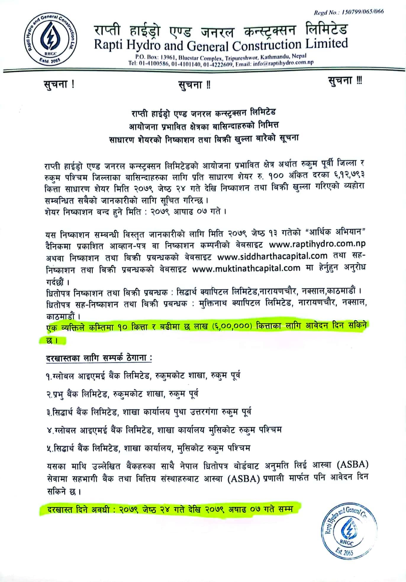 मंगलबारबाट राप्ती हाइड्रो एण्ड जनरल कन्ट्रक्सन लिमिटेडले कम्पनीको सेयरको प्राथमिक सार्वजनिक निष्काशन (आईपीओ) खुला गरेको छ। कम्पनीले आयोजना प्रभावित क्षेत्र रुकुम पूर्वी र रुकुम पश्चिम जिल्लाका स्थानीयबासीहरुका लागि कम्पनीको साधारण सेयरको बिक्री खुला गरेको हो।
