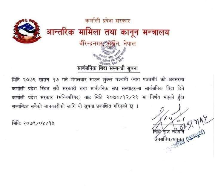 मन्त्रालयद्वरा जारी सार्वजनिक बिदा सम्बन्धी सूचनामा भनिएको छ ‘मिति २०७९ साउन १७ गते मंगलवार साउन शुक्ल पञ्चमी (नागपञ्चमी) को अवसरमा कर्णाली प्रदेशस्थित सबै सरकारी तथा सार्वजनिक संघ संस्थाहरूमा सार्वजनिक विदा दिने निर्णय मन्त्रीपरिषद् बैठकले गरेको छ।’