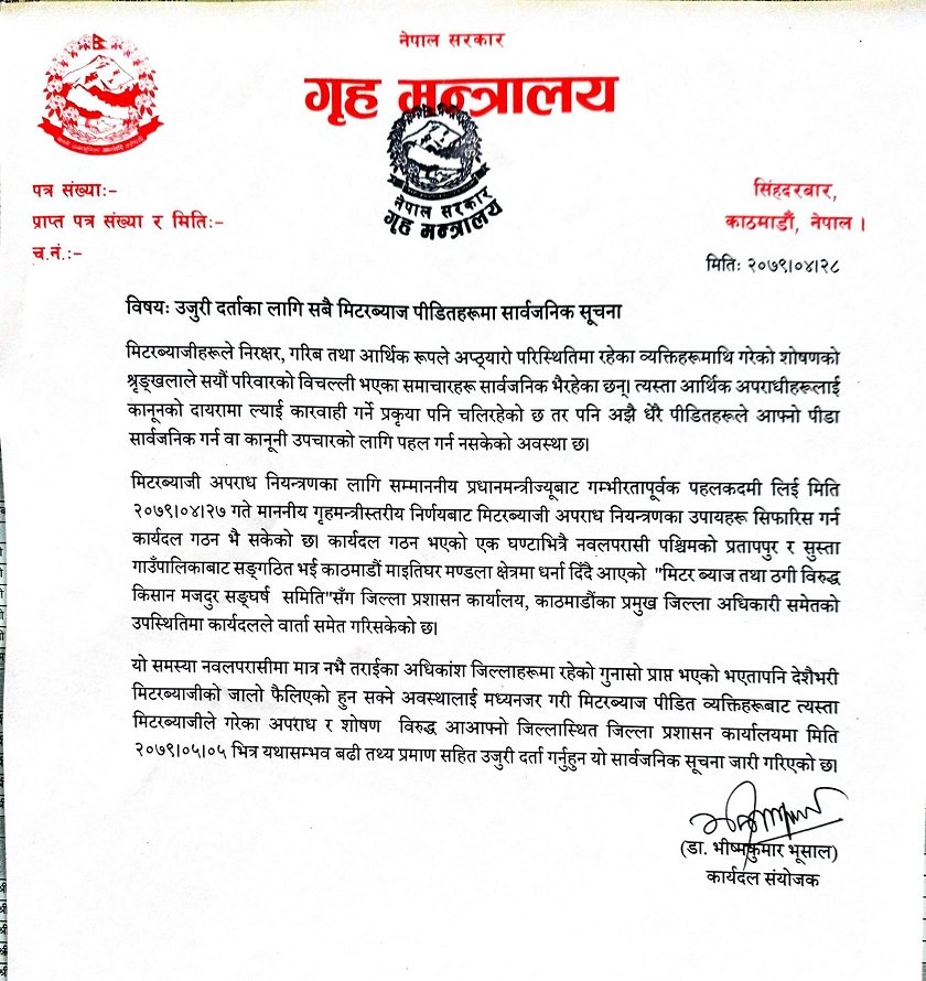 सरकारले देशभर रहेका सबै मिटरब्याज पीडितहरुलाई उजुरी गर्न आग्रह गरेको छ । सरकारले गठन गरेको ‘मिटरब्याजी अपराध नियन्त्रणका उपायहरू सिफारिस गर्न कार्यदल’ले शनिवार एक सूचना प्रकाशन गर्दै एक हप्ताभित्र जिल्ला प्रशासन कार्यालयमा उजुरी दिन आग्रह गरेको छ ।