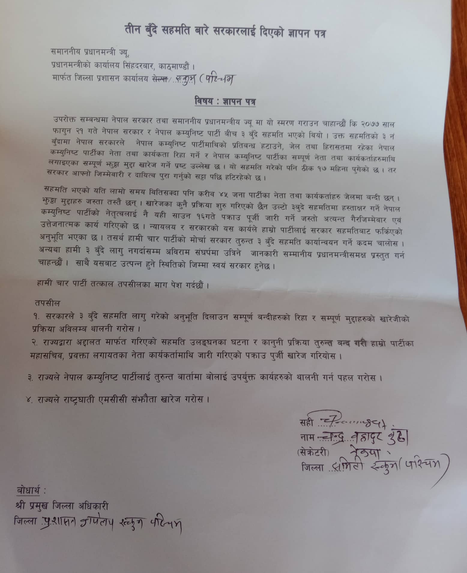 नेकपाका नेता-कार्यकर्ताहरु जिल्ला प्रशासन कार्यालयमा पुगेर  सरकारले तीन बुदे सहमती विरुद्ध जारी गरिएको पक्राउ पुर्जी खारेजीको माग सहितको ज्ञापनपत्र पेश गरेका हुन।