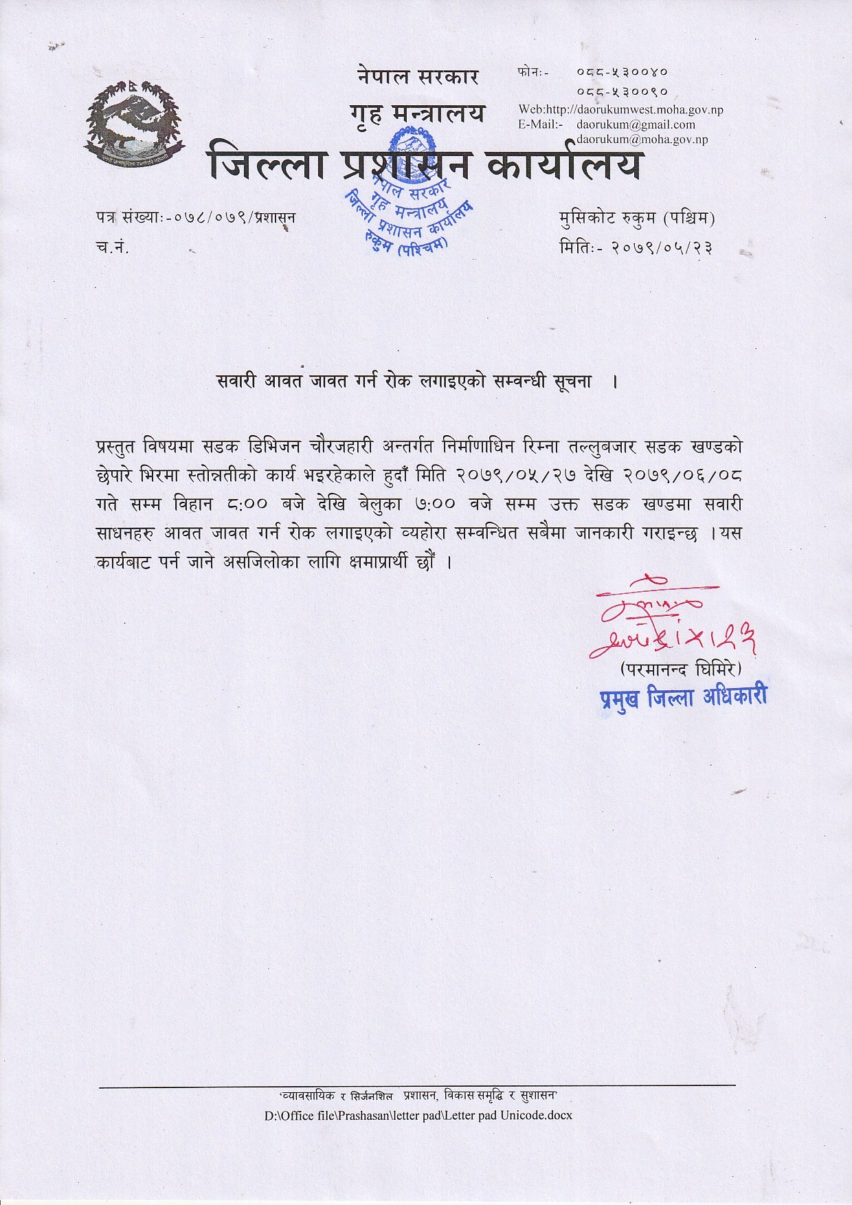 बिहिबार जिल्ला प्रशासन कार्यालय रुकुम पश्चिमले सूचना निकालेर उक्त सडकमा भदौ २७ गते देखि असोज ८ गतेसम्म सवारी आवतजावत बन्द हुने जानकारी गराएको हो ।