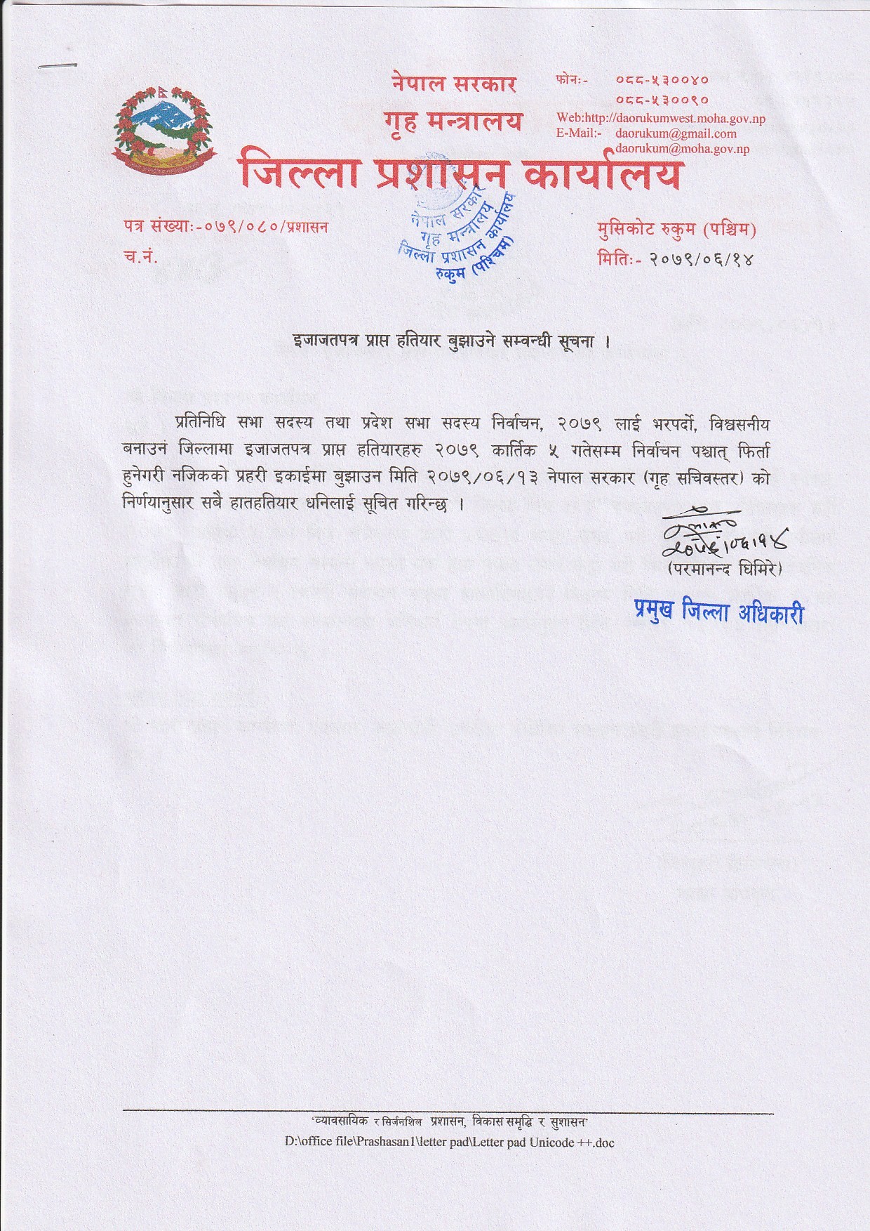 प्रमुख जिल्ला अधिकारी परमानन्द घिमिरेले शुक्रबार सूचना जारी गर्दै कार्तिक ५ गतेसम्म सबैले आफूसँग भएका हातहतियार बुझाउन आग्रह गर्नुभएको छ ।