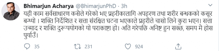 शक्ति निर्देशित र सत्ता संरक्षित घटना भएकाले प्रहरीले चासो लिने कुरा भएन। सत्ता उन्माद र शक्ति दुरूपयोगको यो पराकाष्टा हो। अति गरेपछि अनिष्ट हुन सक्छ, समय मै होस पुर्याउँ।