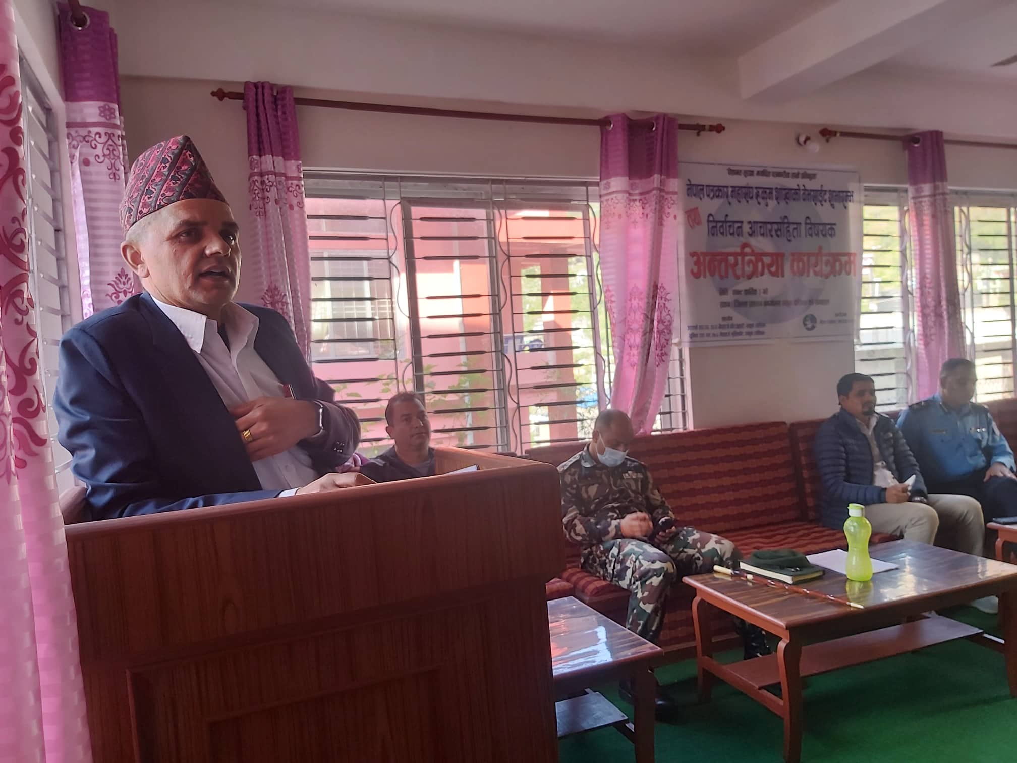 कार्यक्रममा कोष तथा लेखा नियन्त्रक कार्यालय प्रमुख तथा निर्वाचन आचारसंहिता अनुगमण अधिकृत बोमलाल परजुलीले मंसिर ४ गते हुने प्रतिनिधि सभा र प्रदेश सभा निर्वाचन आचारसंहिताका बारेमा जानकारी गराउनुभएको थियो ।