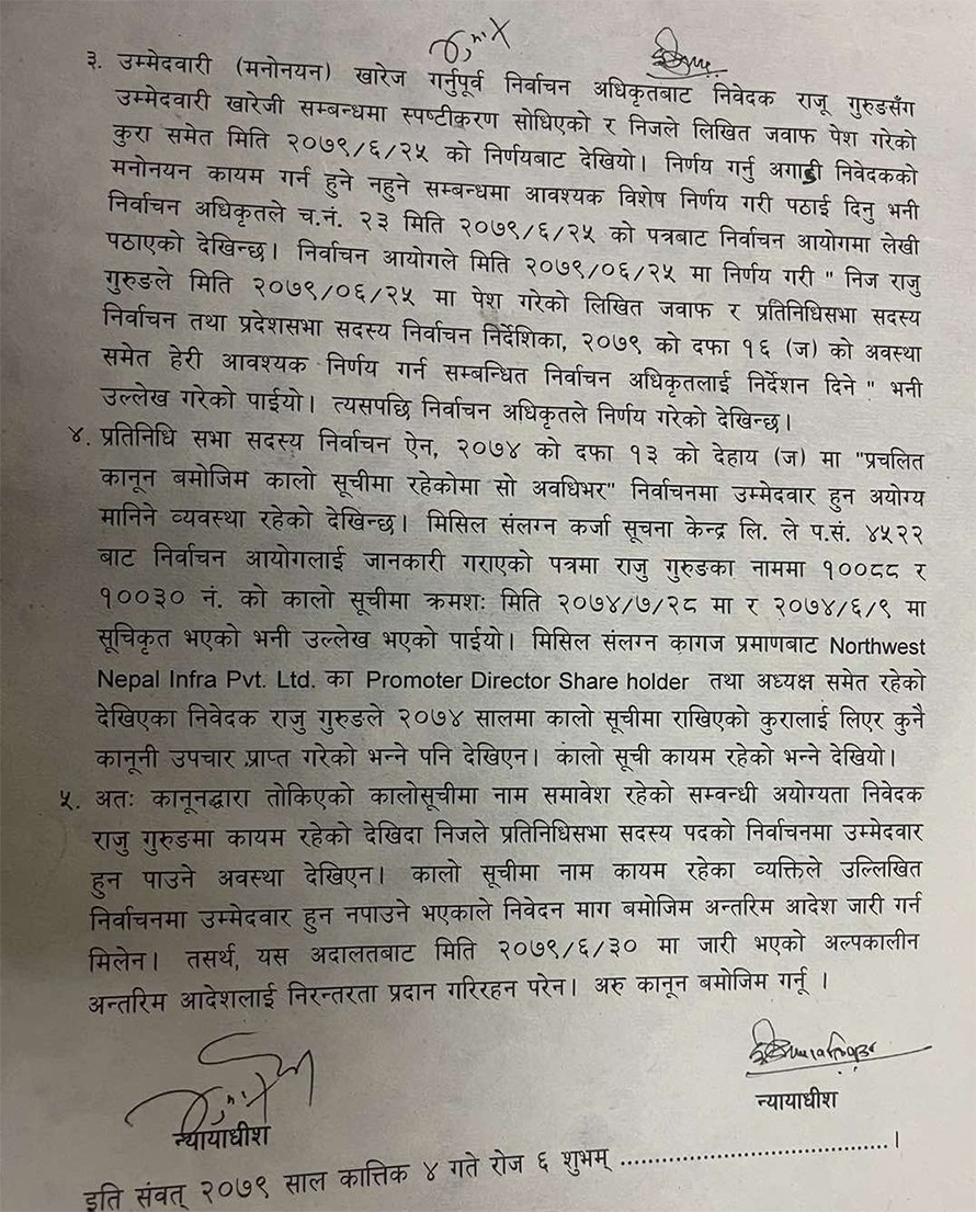 ‘कानुनद्वारा तोकिएको कालोसूचीमा नाम समावेश रहेकोसम्बन्धी अयोग्यता निवेदक राजु गरूङमा कायम रहेको देखिँदा निजले प्रतिनिधि सभा सदस्य पदको निर्वाचनमा उम्मेदवार हुन पाउने अवस्था देखिएन,’ उक्त इजलासको आदेशमा भनिएको छ।
