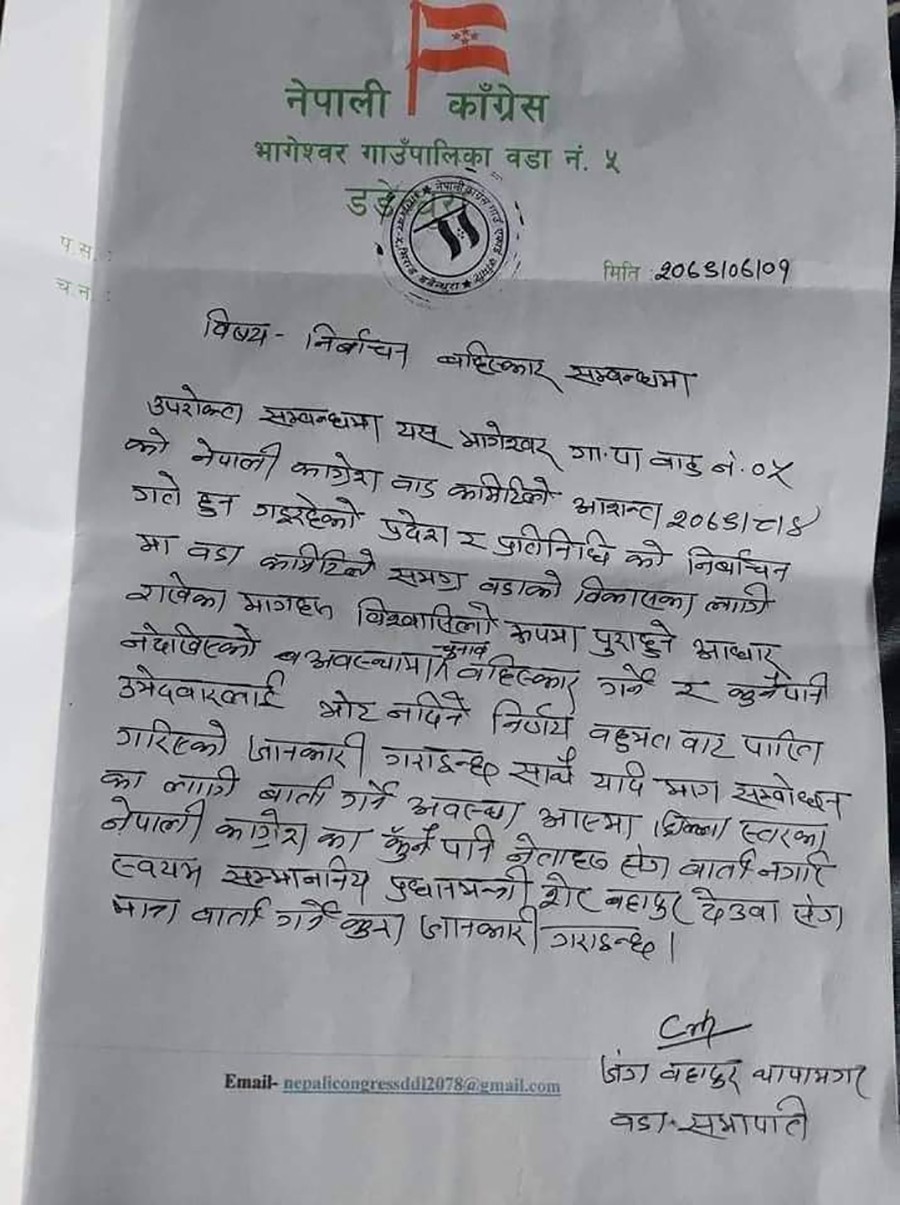 भागेश्वर गाउँपालिका-५ को नेपाली कांग्रेसको वडा समितिले मंसिर ४ मा हुने प्रतिनिधि सभा र प्रदेश सभा निर्वाचन बहिष्कार गर्ने निर्णय गरेको जानकारी दिएको छ ।