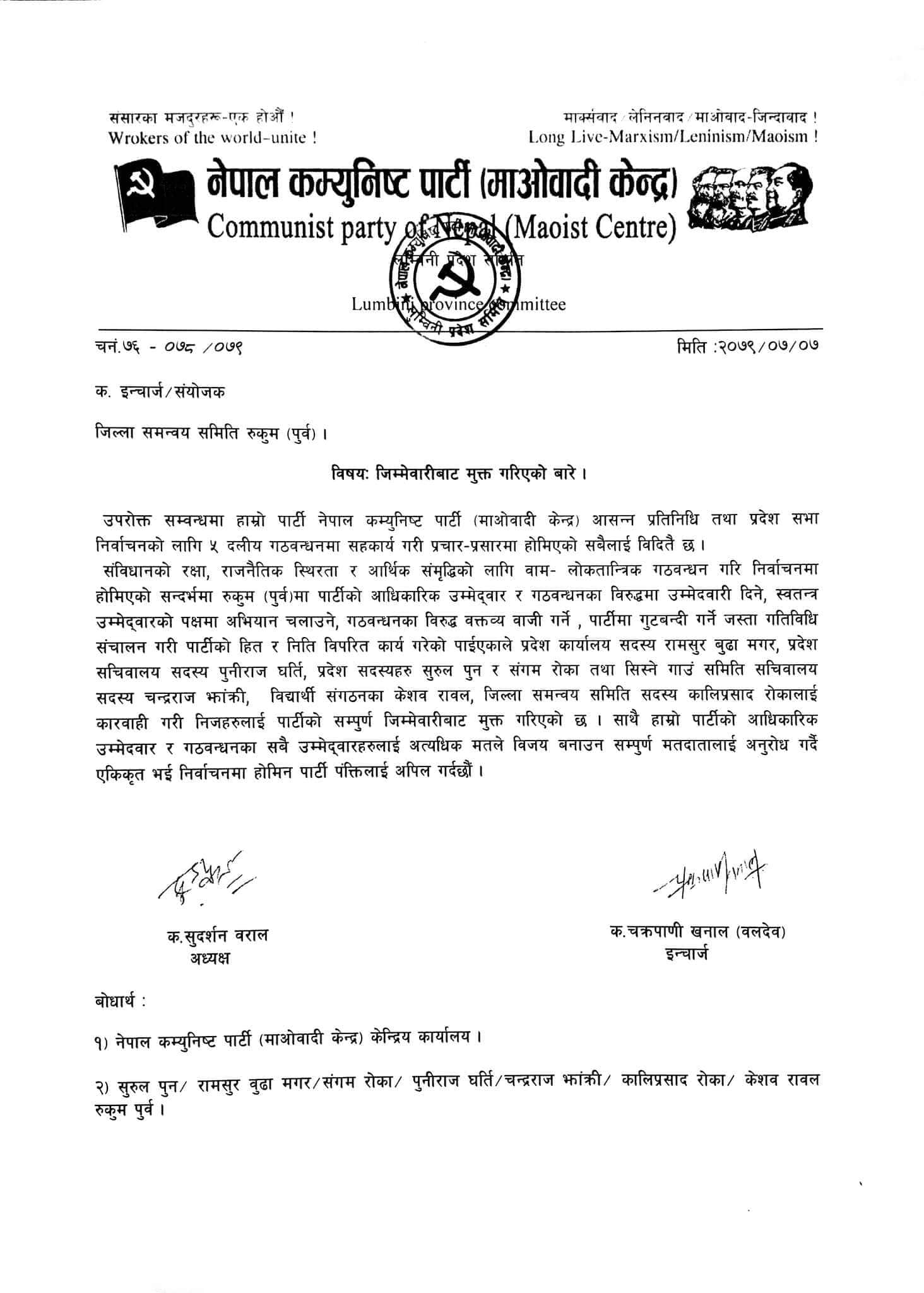 नेकपा माओवादी केन्द्र लुम्बिनी प्रदेश कार्यालय सदस्य रामसुर बुढामगर, प्रदेश सचिवालय सदस्य पुनिराज घर्ती, प्रदेश सदस्यहरु सुरुल पुन, संगम रोका, तथा सिस्ने गाउँपालिका समिति सचिवालय सदस्य चन्द्रराज झाक्री, विद्यार्थी नेता केशव रावल, जिल्ला समन्वय समिति सदस्य कालीप्रसाद रोकालाई कारबाही गरी पार्टीको सम्पूर्ण जिम्मेवारीबाट मुक्त गरिएको विज्ञप्तीमा उल्लेख गरिएको छ ।