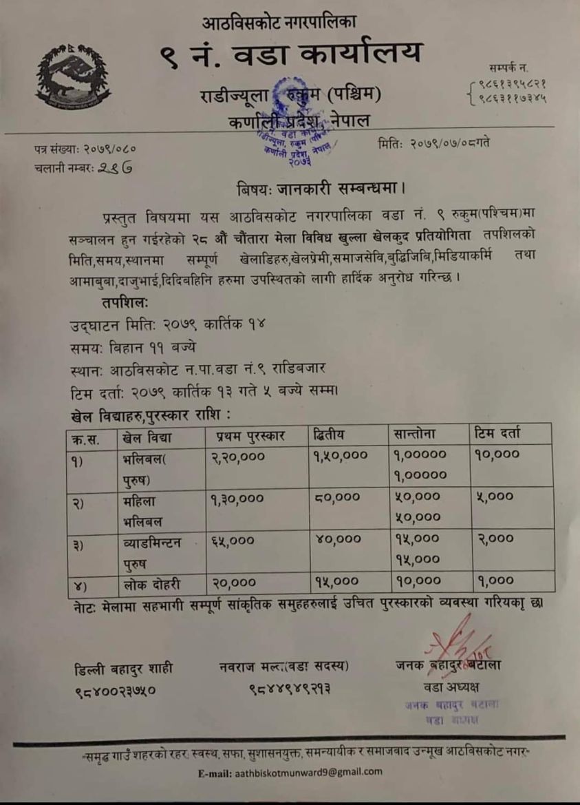कार्तिक १४ गते देखि स्थानीय चौतारा मेलाको अवसरमा आठबीसकोट नगरपालिका वडा नम्बर ९ मा २ लाख २० हजार पुरस्कार राशिको भलिबल प्रतियोगिता हुने भएको हो । यो प्रतियोगिता जिल्लाकै अहिलेसम्मकै ठूलो पुरस्कार राशिको हो ।