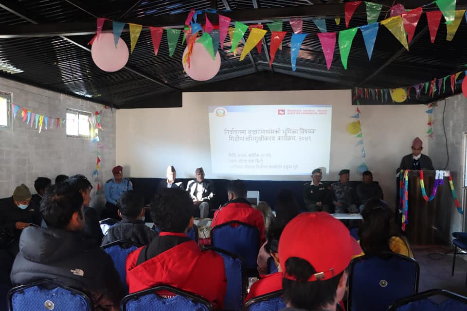 मुख्य निर्वाचन अधिकृत खडग बहादुर केसीको अध्यक्षतामा सम्पन्न भएको मिडिया अभिमुखीकरणमा प्रमुख जिल्ला अधिकारी परमानन्द घिमिरे, सुरक्षा निकायका प्रमुख लगायत जिल्ला स्थित क्रियाशिल पत्रकारहरुको उपस्थिति रहेको थियो ।