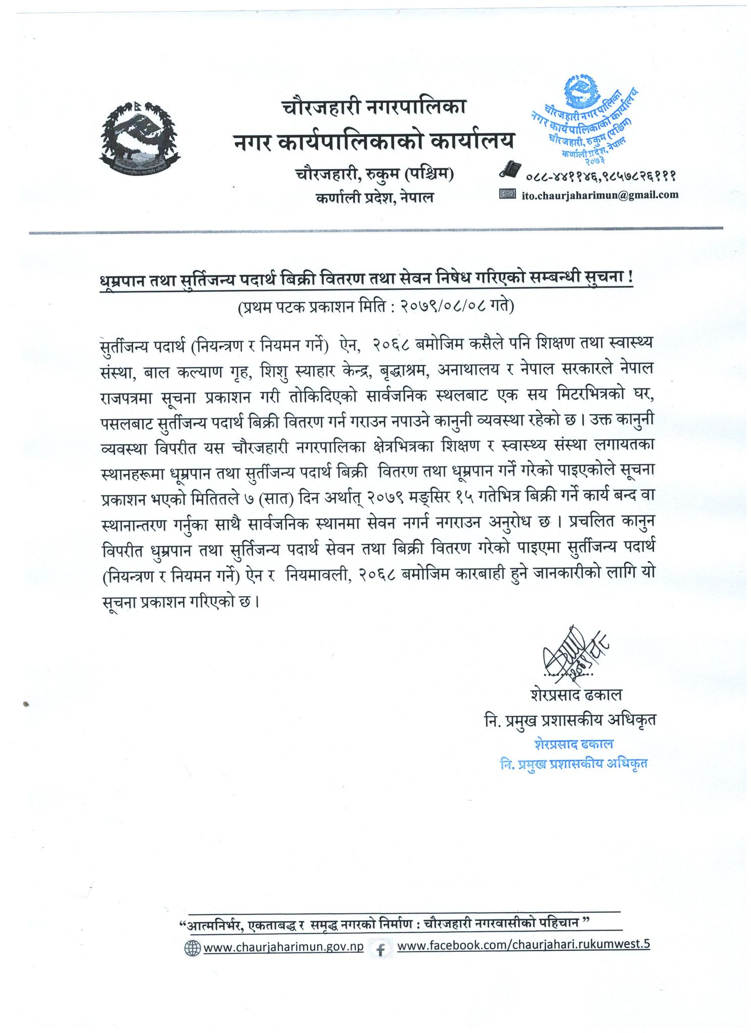 मुसिकोट । रुकुम पश्चिमको चौरजहारी नगरपालिकाले धूम्रपान तथा सुर्तिजन्य पदार्थ बिक्री बितरण तथा सेवन नगर्न नगराउन अनुरोध गरेको छ । तोकिएको सार्वजनिक स्थलबाट एक सय मिटरभित्रको घर, पसलबाट सुर्तिजन्य पदार्थ बिक्री वितरण गर्न गराउन नपाउने कानुनी व्यवस्था रहेको नगरपालिकाले जनाएको छ ।
