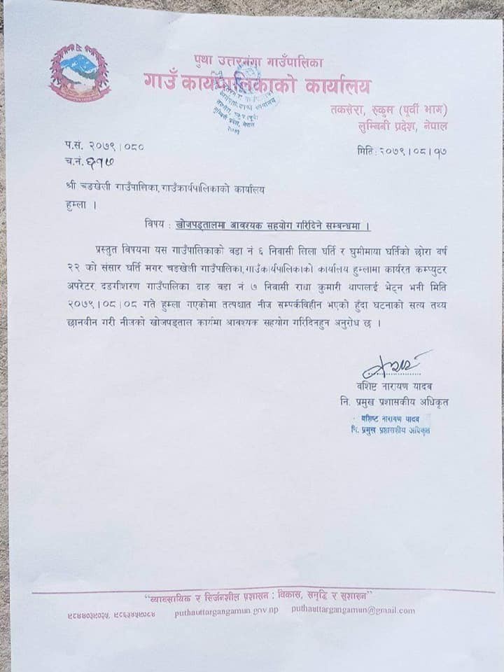 संसारको खोजीको लागी सहयोग गरिदिन गाउँपालिकाले अनुरोध गरेको छ ।