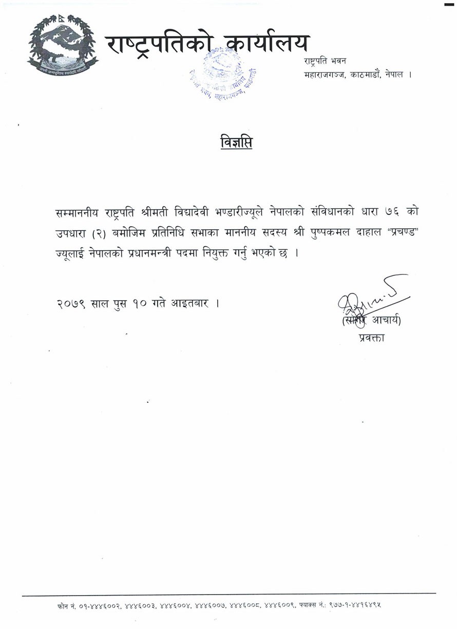 नेकपा माओवादी केन्द्रका अध्यक्ष पुष्पकमल दाहाल ‘प्रचण्ड’ प्रधानमन्त्रीमा नियुक्त भएका छन् । राष्ट्रपति विद्यादेवी भण्डारीले आइतबार साँझ पुष्पकमल दाहाललाई प्रधानमन्त्रीमा नियुक्त गरेकी हुन् ।