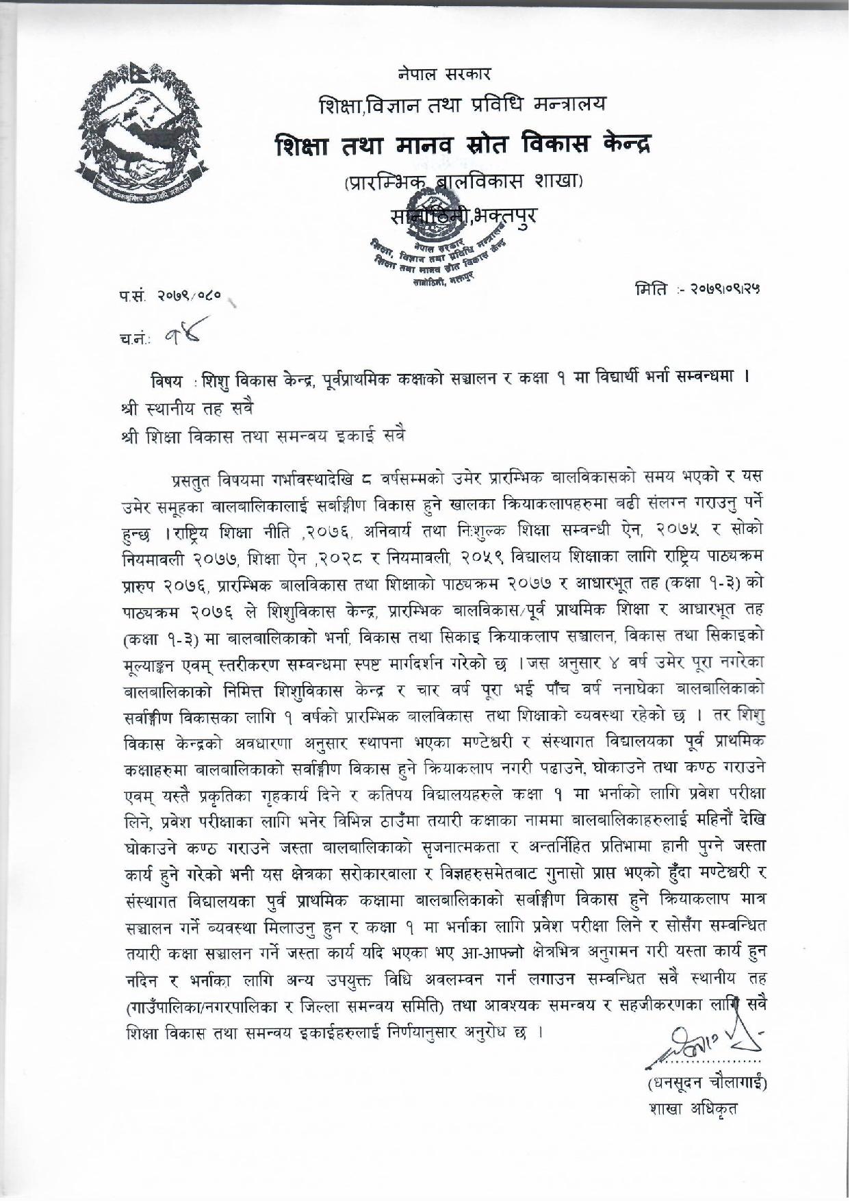 गर्भावस्थादेखि ८ वर्षसम्मको उमेर प्रारम्भिक बालविकासको समय भएको र यस उमेर समूहका बालबालिकालाई सर्बाङ्गीण विकास हुने खालका क्रियाकलापहरुमा बढी संलग्न गराउनु पर्ने  निर्देशन पत्रमा उल्लेख गरिएको छ ।