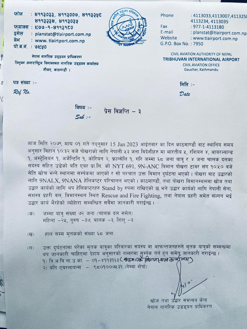 नेपाल नागरिक उड्डयन प्राधिकरणको खोज तथा उद्धार समन्वय केन्द्रले विज्ञप्ति निकालेर आइतबार अपराह्न साढे ४ बजेसम्ममा ६८ शव दुर्घटनास्थलबाट निकालिएको जानकारी दिएको हो । केन्द्रका अनुसार अन्य शव खोजी जारी छ ।