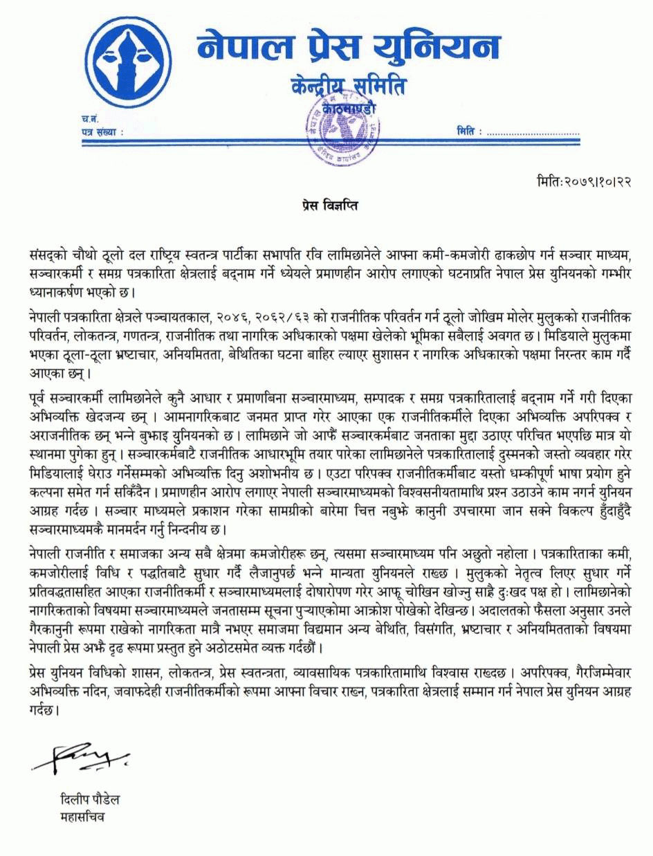 राष्ट्रिय स्वतन्त्र पार्टीका सभापति रवि लामिछानेले आफ्ना कमजोरी ढाकछोप गर्न सञ्चार माध्यम, सञ्चारकर्मी र समग्र पत्रकारिता क्षेत्रलाई बदनाम गर्ने उद्देश्यले प्रमाणहीन आरोप लगाएको घटनाप्रति नेपाल प्रेस युनियनले आपत्ति जनाएको छ ।