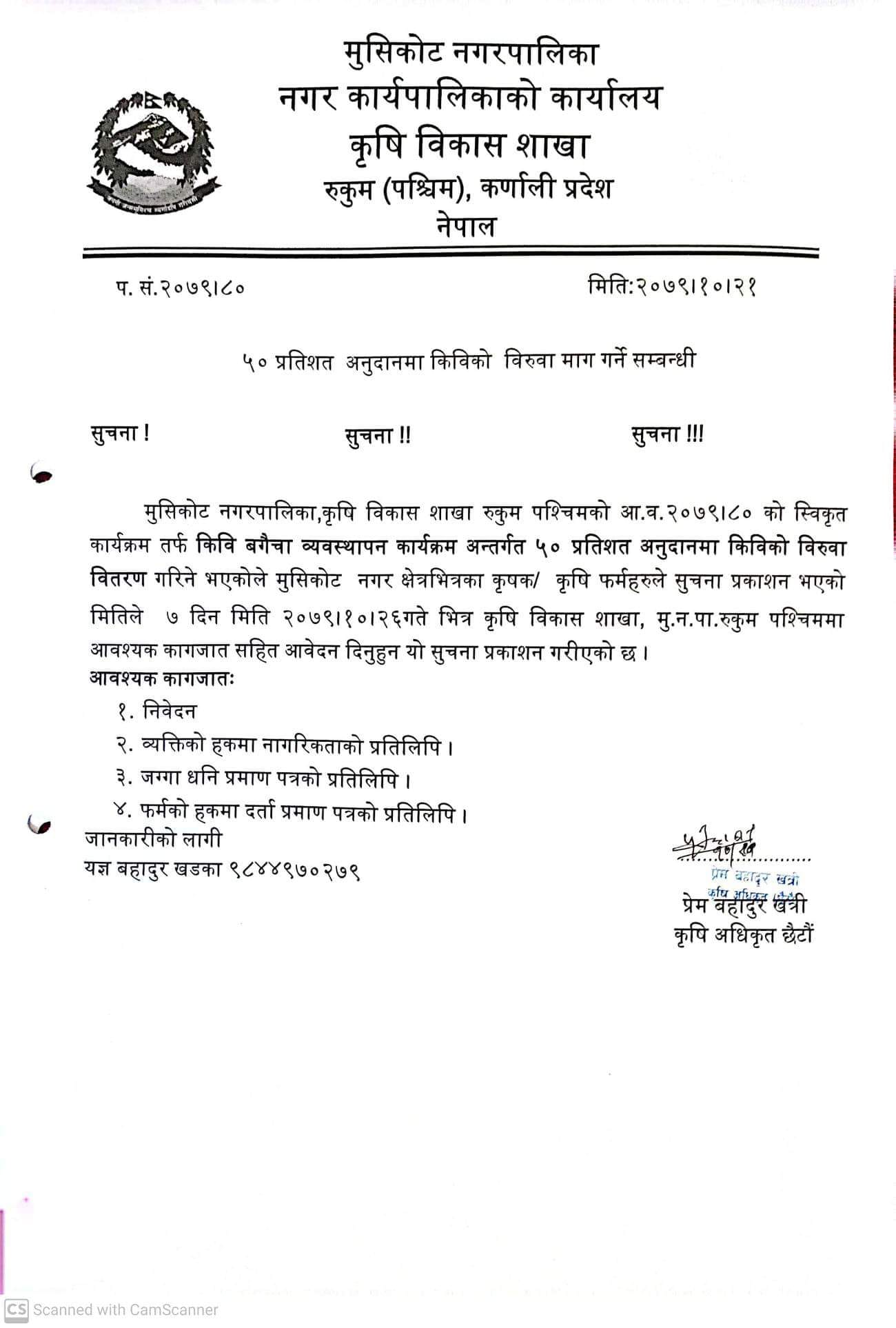 नगरपालिकाले माघ २६ गते भित्र नगर क्षेत्रका कृषि फर्म तथा किसानहरुले आवश्यक कागजात सहित नगरपालिकाको कृषि शाखामा सम्पर्क गर्ने अनुरोध गरेको छ ।