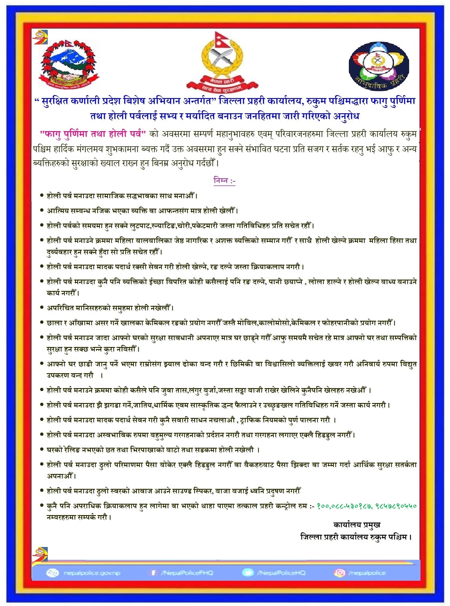 शुक्रबार जिल्ला प्रहरी कार्यालय रुकुम पश्चिमले एक सन्देश जारी गरी होली पर्वलाई सभ्य, शिष्ट, स्वस्थकर र मर्यादित तवरले मनाउन जिल्लाबासीलाई अनुरोध गरेको हो ।