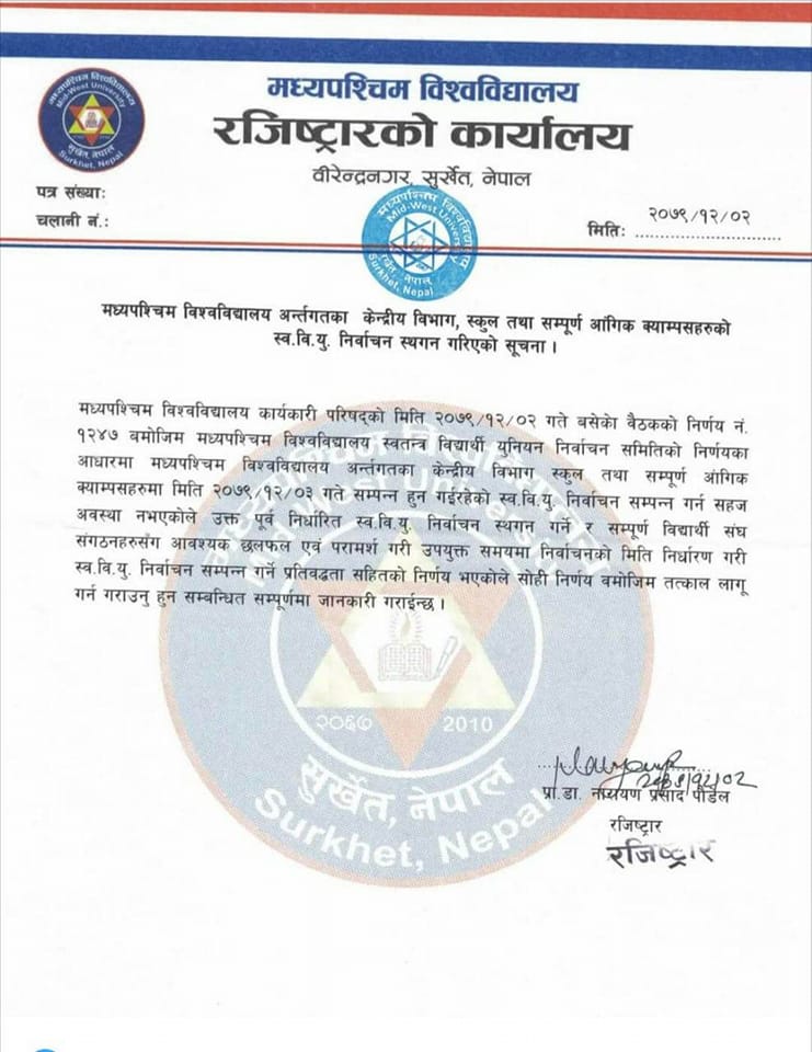 सुर्खेत । मध्यपश्चिम विश्वविद्यालयले सबै आंगिक क्याम्पसका स्ववियु निर्वाचन स्थगित गरेको छ।