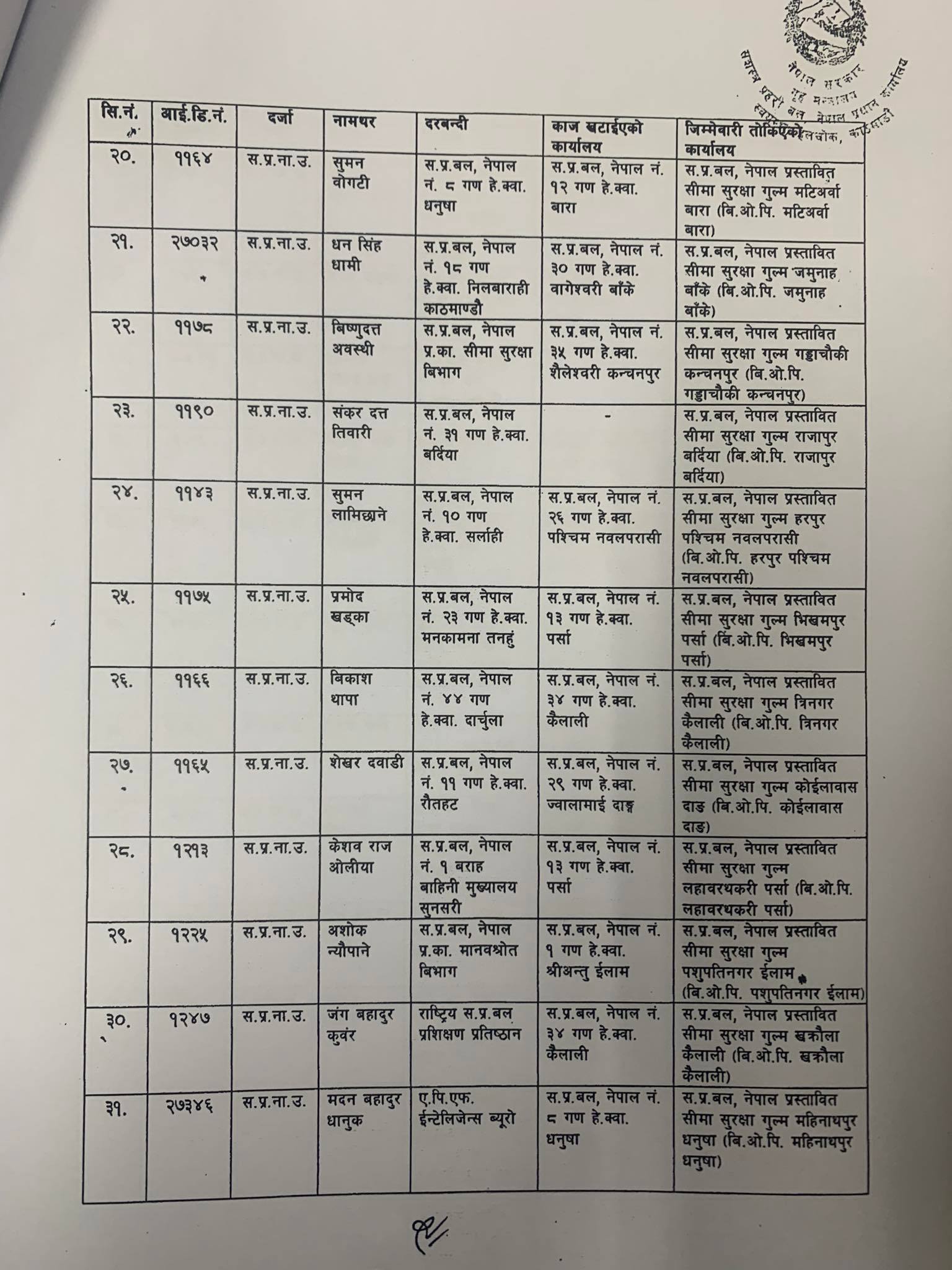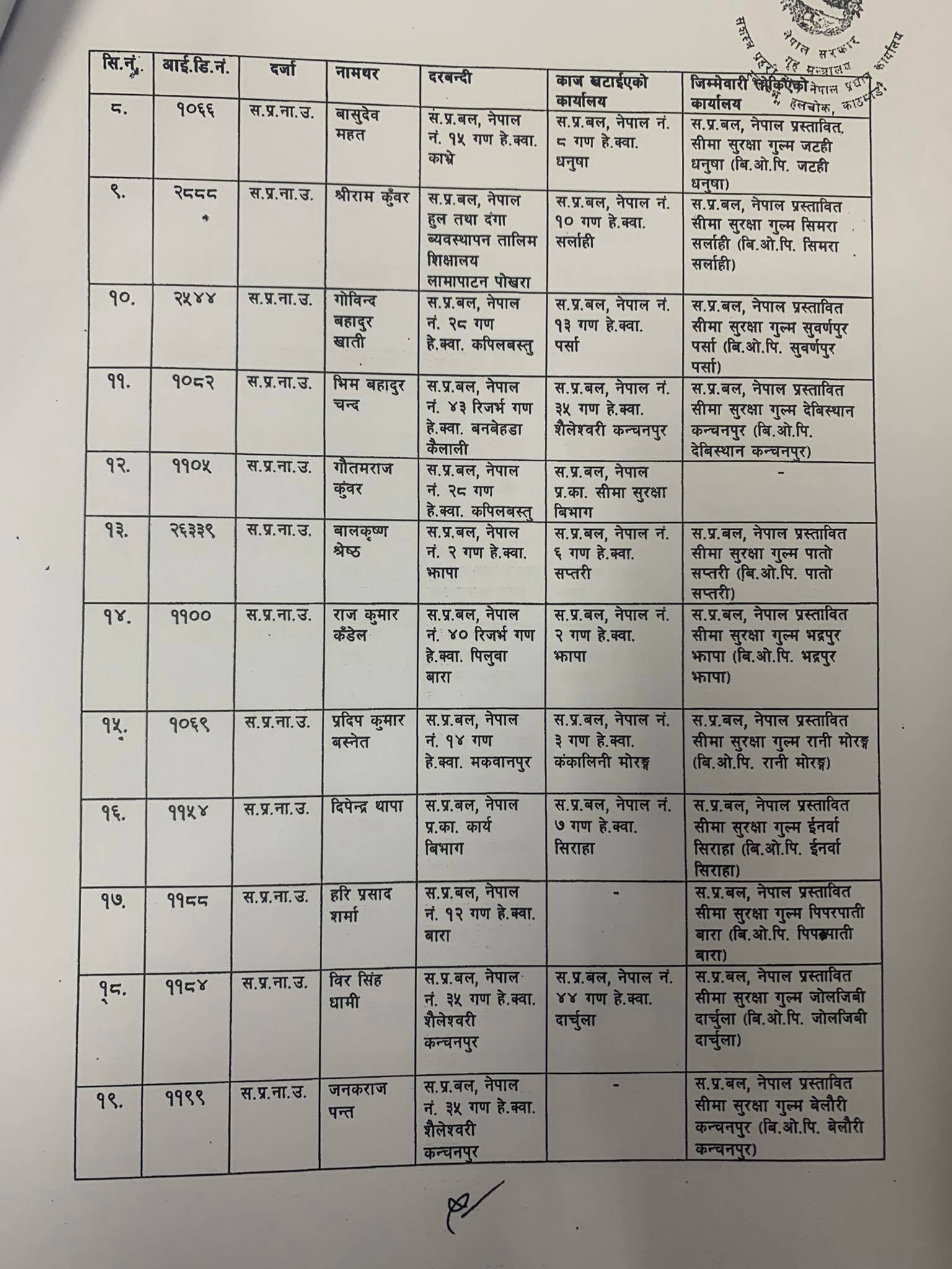 उनीहरुलाई जेष्ठता अनुसार क्रमशः प्रस्तावित सीमा सुरक्षा गुल्म, बोर्डर आउट पोष्ट (बीओपी) र अस्थायी सुरक्षा बेसहरुको कमाण्ड जिम्मेवारीमा खटाइएको डीआईजी थापाले बताए।