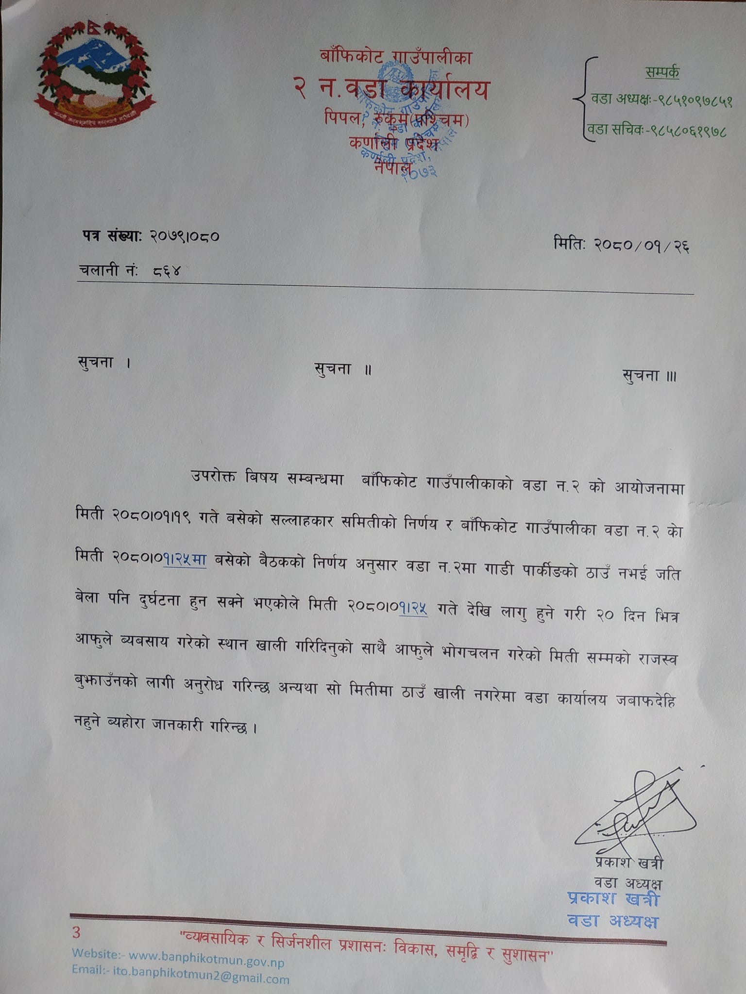 मुसिकोट । रुकुम पश्चिमको बाँफिकोट गाउँपालिका वडा नम्वर २ ले सार्वजनिक स्थानमा राखिएका व्यवसायीक संरचनाहरु हटाउन अनुरोध गरेको छ ।