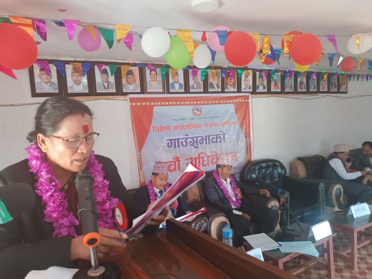 त्रिवेणी । रुकुम पश्चिमको त्रिवेणी गाउँपालिकाले आगामी आर्थिक वर्ष ०८०/८१ को नीति तथा कार्यक्रम र बजेट गाउँ सभामा पेश गरेको छ । आईतबार त्रिवेणी गाउँपालिकाको सभा हल खारनेटामा आयोजित गाउँसभाको नवौै अधिवेशनमा नीति तथा कार्यक्रम र बजेट बक्तव्य पेश गरिएको हो ।