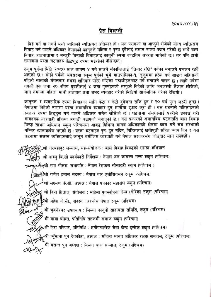 बुधबार रुकुम पश्चिममा रहेका महिला तथा बालबालिकाको अधिकारको क्षेत्रमा काम गर्ने विभिन्न सरोकारवाला निकायले सयुक्तरुपमा प्रेस विज्ञप्ती निकाल्दै युवती माथि दुव्र्यबहार गर्नेहरुलाई कडा कार्बाहीको माग गरिएको हो ।