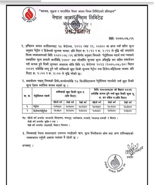 निगमका अनुसार पेट्रोलमा लिटरको रु एक रुपैयाँ र तथा डिजेल र मटिट्तेलमा लिटरको ३ रुपैयाँ मूल्य वृद्धि भएको छ ।