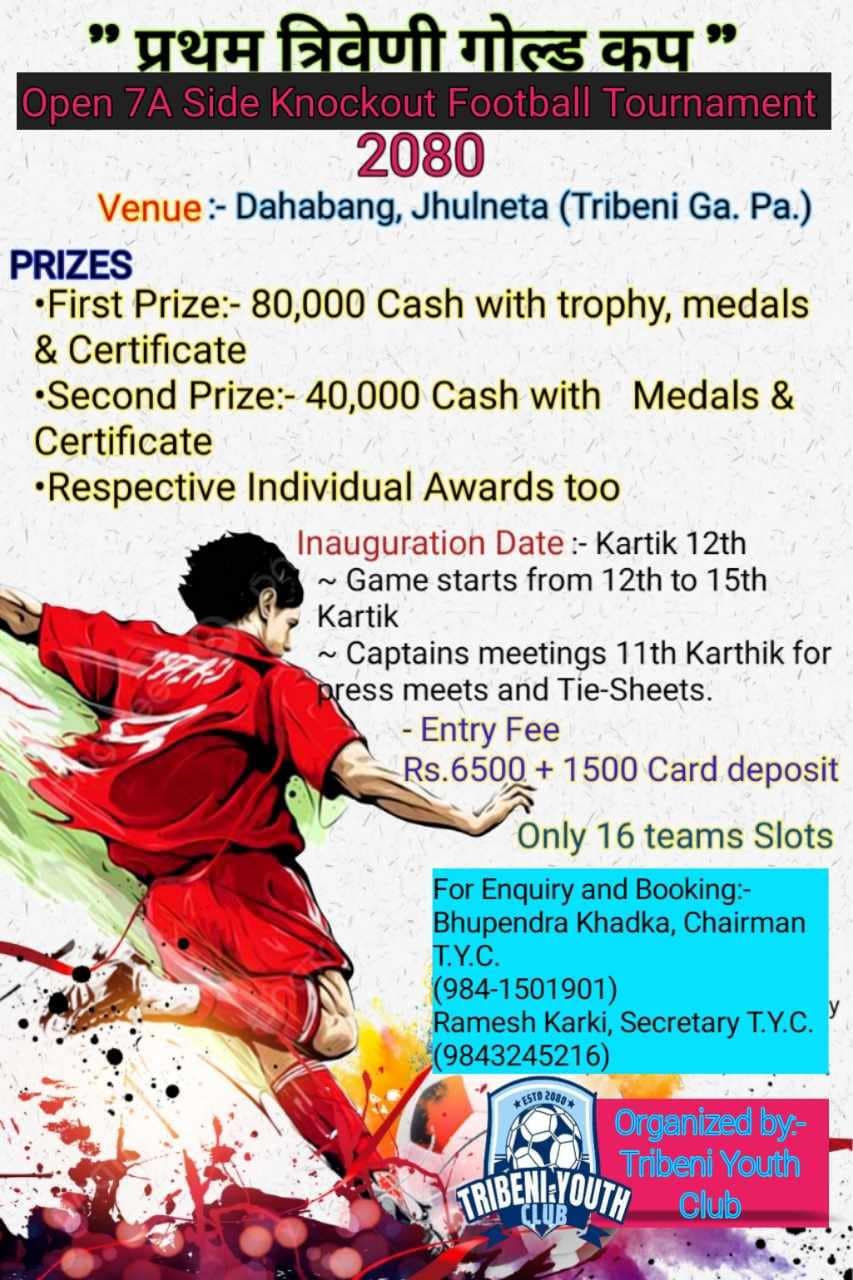 मुसिकोट । त्रिवेणी युथ क्लबको रुकुम पश्चिमको आयोजनामा झुल्नेटामा “प्रथम त्रिवेणी गोल्डकप फुटबल प्रतियोगिता” सञ्चालन हुने भएको छ । हिन्दुहरुको महान चाड वडा दशै तथा शुभ दिपावलीको अवसरमा त्रिवेणी गोल्डकप फुटबल प्रतियोगिता सञ्चालन हुने भएको हो।