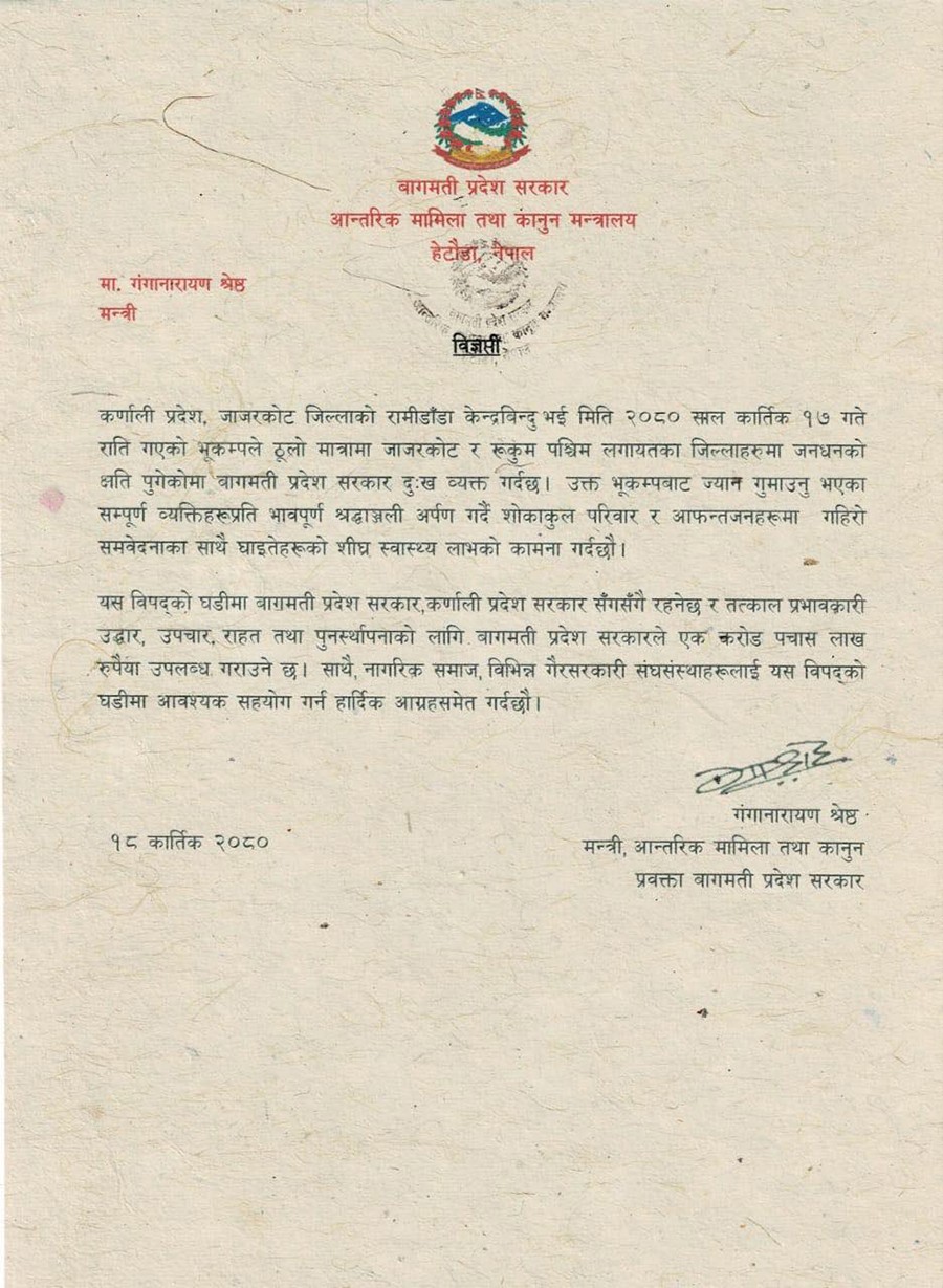 यस विपद् घडीमा बागमती प्रदेश सरकार कर्णाली प्रदेश सरकार सँगसँगै रहने भन्दै भूकम्पबाट ज्यान गुमाएका व्यक्तिहरुप्रति भावपूर्ण श्रद्धाञ्जलीका साथै शोकाकुल परिवार र आफन्तजनहरुमा गहिरो संवेदन प्रकट गर्दै घाइतेहरुको शीघ्र स्वास्थ्य लाभको कामना समेत विज्ञप्ति मार्फत गरेको छ ।