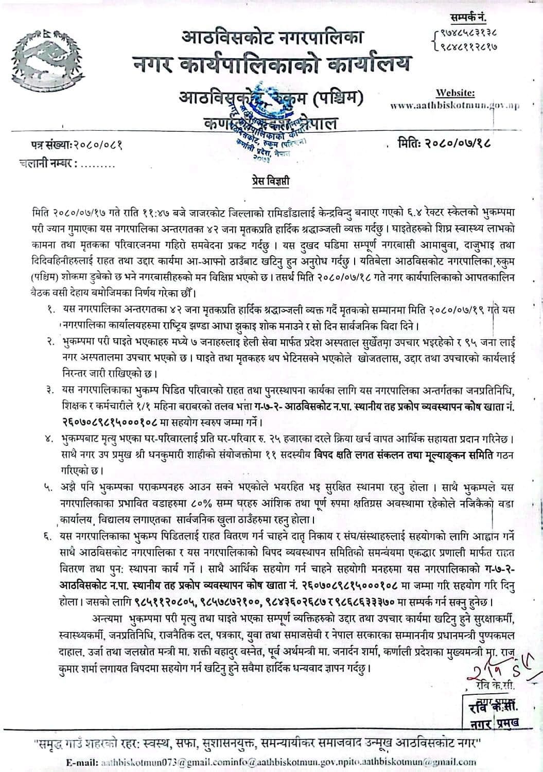 नगर प्रमुख रवि केसीले शनिवार कार्यपालिका बैठक गरेर शोक बिदासहित अन्य निर्णय गरेको जानकारी दिनुभयो । उहाँका अनुसार नगरपालिकाका कार्यालयमा राष्ट्रिय झन्डा आधा झुकाइने, नगरपालिकामा कार्यरत शिक्षक, कर्मचारी र जनप्रतिनिधिले एक–एक महिनाको तलब, भत्ता पालिकाको प्रकोप व्यवस्थापन कोषमा जम्मा गर्ने निर्णय समेत भएको छ ।