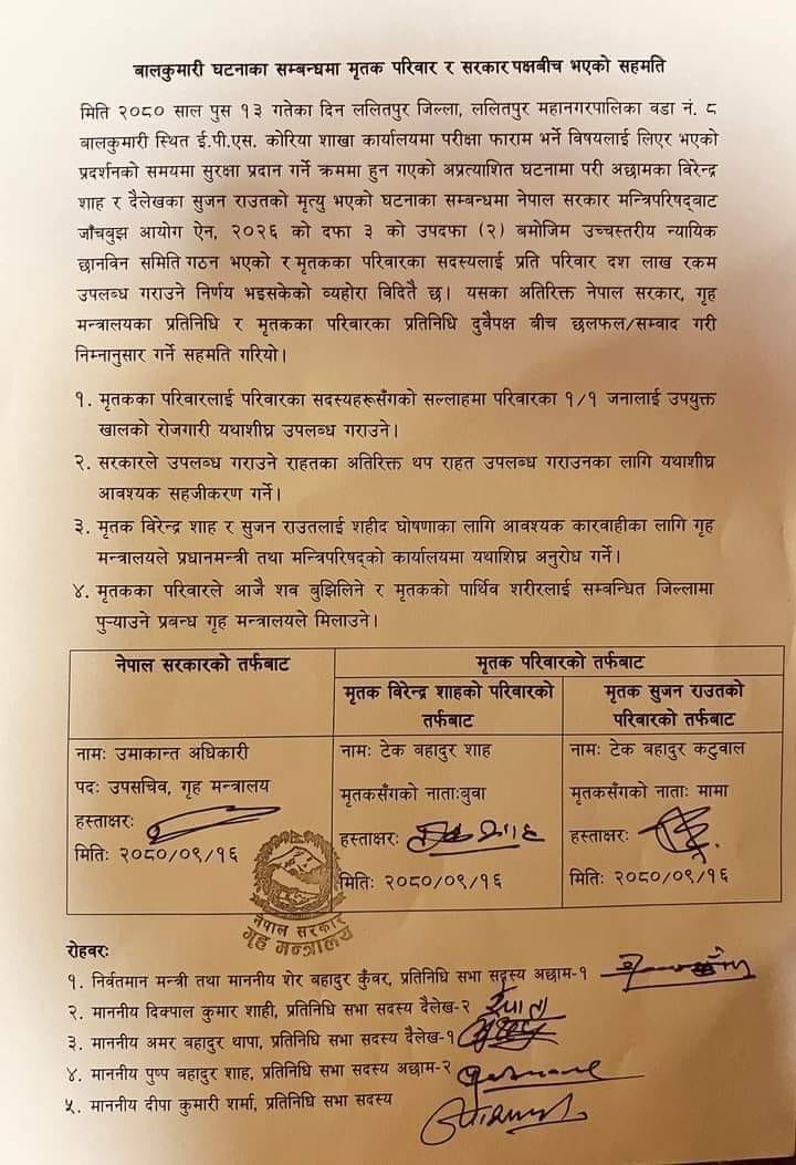 गत शुक्रबार ललितपुरको बालकुमारीमा प्रदर्शनको क्रममा प्रहरीको बल प्रयोग र गोली प्रहारबाट अछामका वीरेन्द्र शाह र दैलेखका सुजन राउतको ज्यान गएको थियो ।गृह मन्त्रालयले सोमबार पीडित परिवारसँगको छलफलपछि शाह र राउतलाई सहिद घोषणा गर्ने सम्झौता गरेको हो । मन्त्रालयले शाह र राउनलाई सहिद घोषणाको प्रस्ताव मन्त्रिपरिषद्मा लैजाने सहमतिमा उल्लेख छ ।