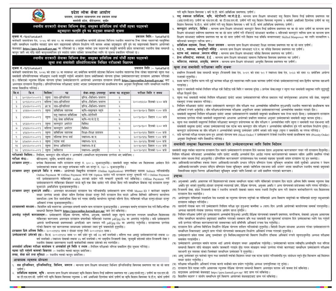 प्रदेश लोक सेवा आयोग कर्णाली प्रदेशले विभिन्न पदका लागि दरखास्त आह्वान गरेको छ । स्थानीय सरकारी सेवाका विभिन्न सेवा, समूहका प्राविधिकतर्फ पाँचौँ तहका लागि दरखास्त माग गरिएको हो ।
