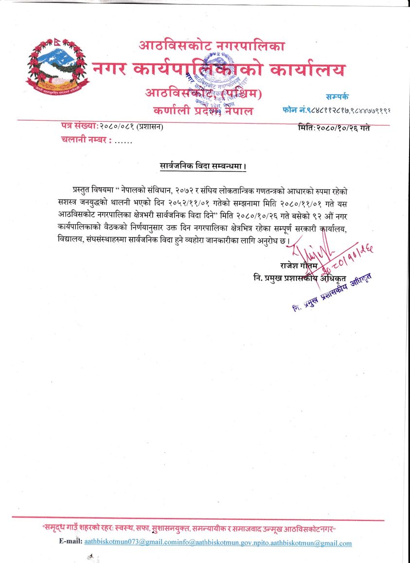 आठविसकोट नगरपालिकाका निमित्त प्रमुख प्रशासकीय अधिकृत राजेश गौतमले शुक्रबार निकालेको सूचनामा फागुन १ गते ‘जनयुद्ध दिवस’ को अवसरमा बिदा दिने उल्लेख छ।