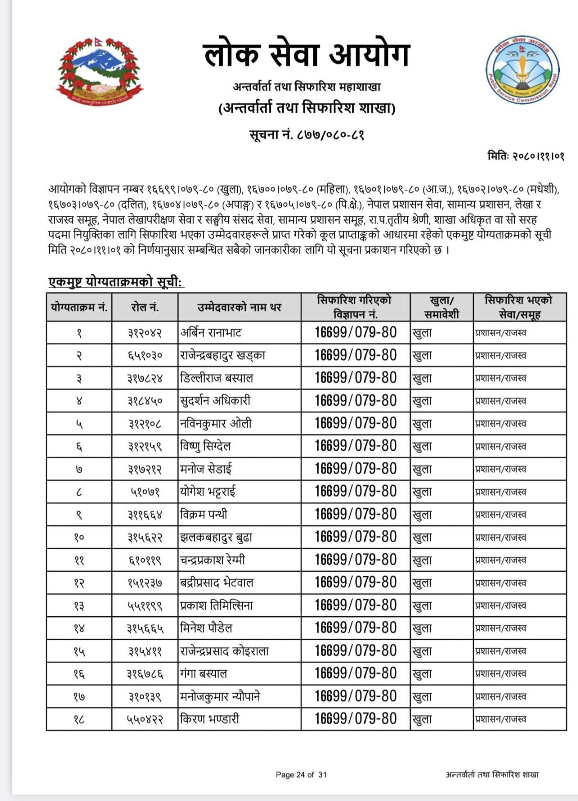 आयोगले अन्तर्वार्ता र लिखित दुवैमा सफल भएका उम्मेदवारहरूले प्राप्त गरेको कूल प्राप्ताङ्कको आधारमा उनीहरूको नाम मंगलबार प्रकाशित गरेको छ।