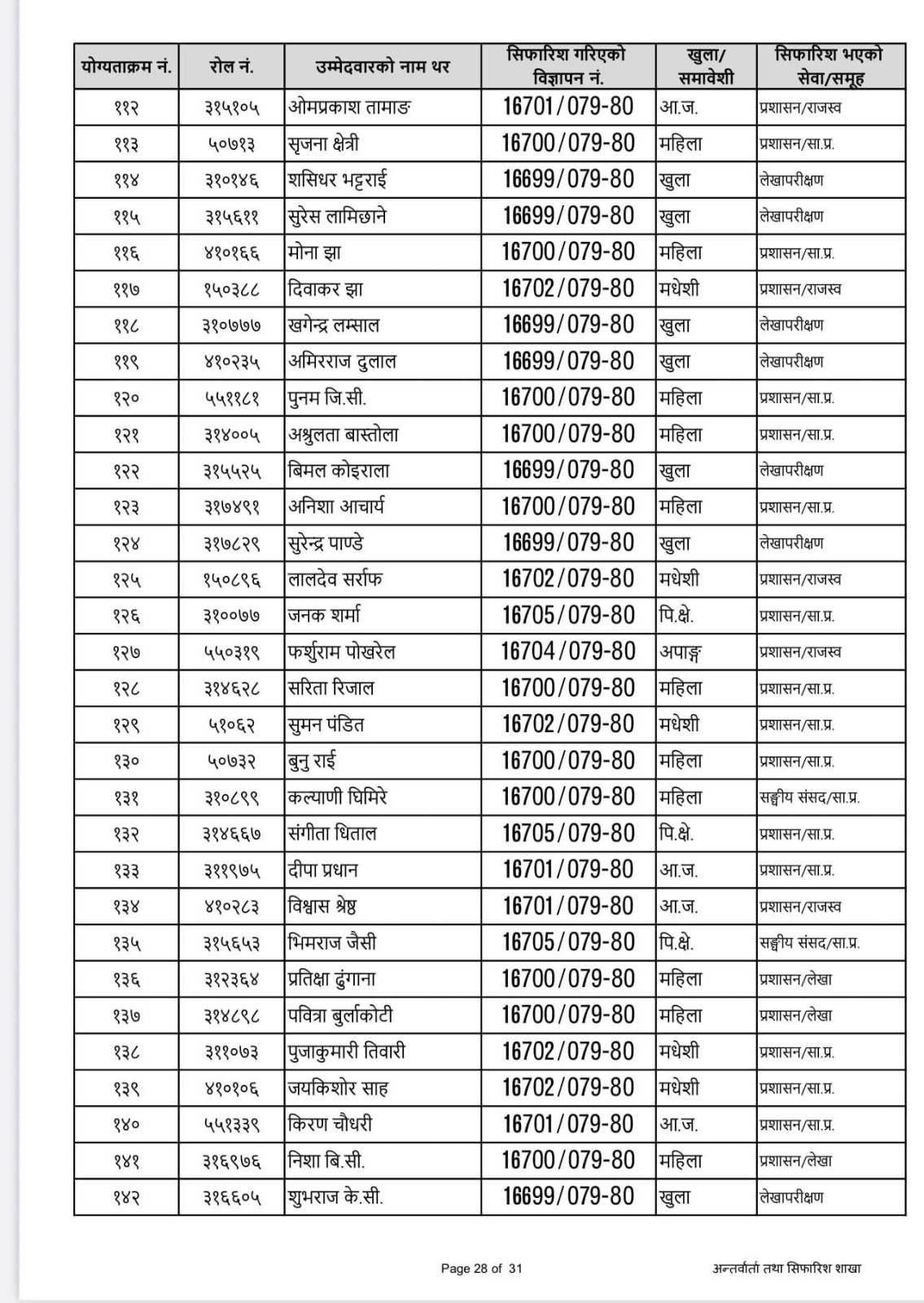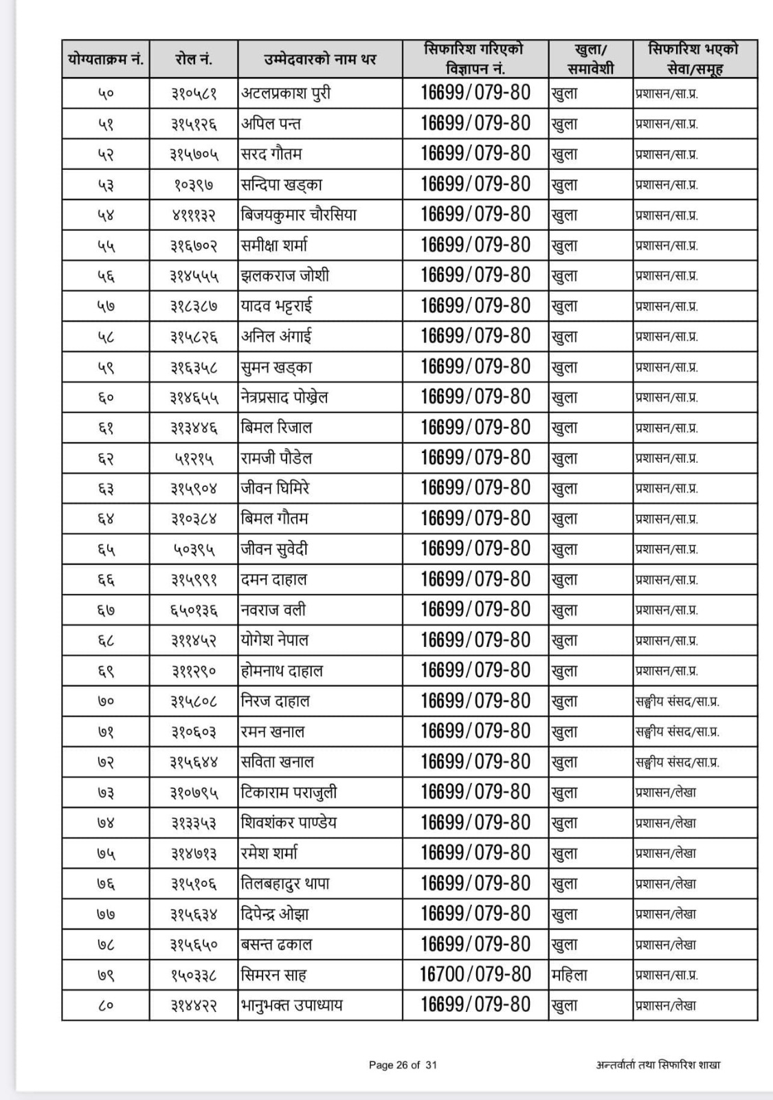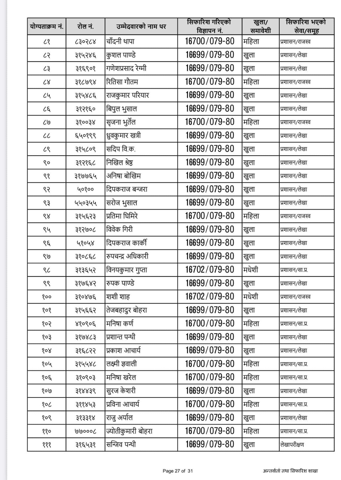 नेपाल प्रशासन सेवा, सामान्य प्रशासन, लेखा र राजस्व समूह, नेपाल लेखापरीक्षण सेवा र सङ्घीय संसद सेवा, सामान्य प्रशासन समूह, राजपत्रांकित तृतीय श्रेणी, शाखा अधिकृत वा सो सरह पदमा नियुक्तिका लागि सिफारिस भएको हो।