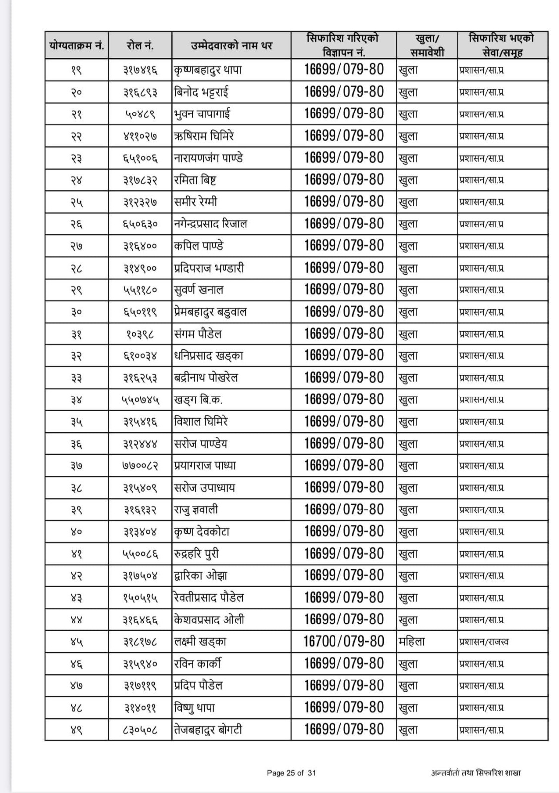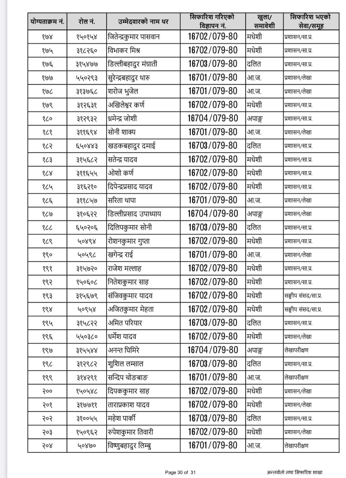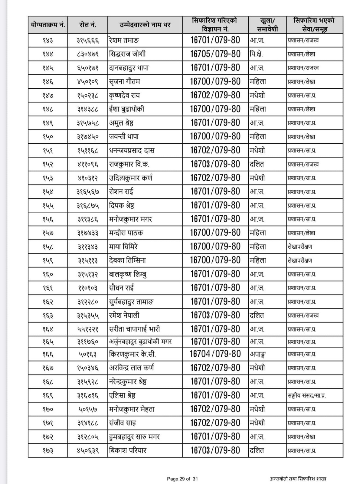 नेपाल प्रशासन सेवा, सामान्य प्रशासन, लेखा र राजस्व समूह, नेपाल लेखापरीक्षण सेवा र सङ्घीय संसद सेवा, सामान्य प्रशासन समूह, राजपत्रांकित तृतीय श्रेणी, शाखा अधिकृत वा सो सरह पदमा नियुक्तिका लागि सिफारिस भएको हो।