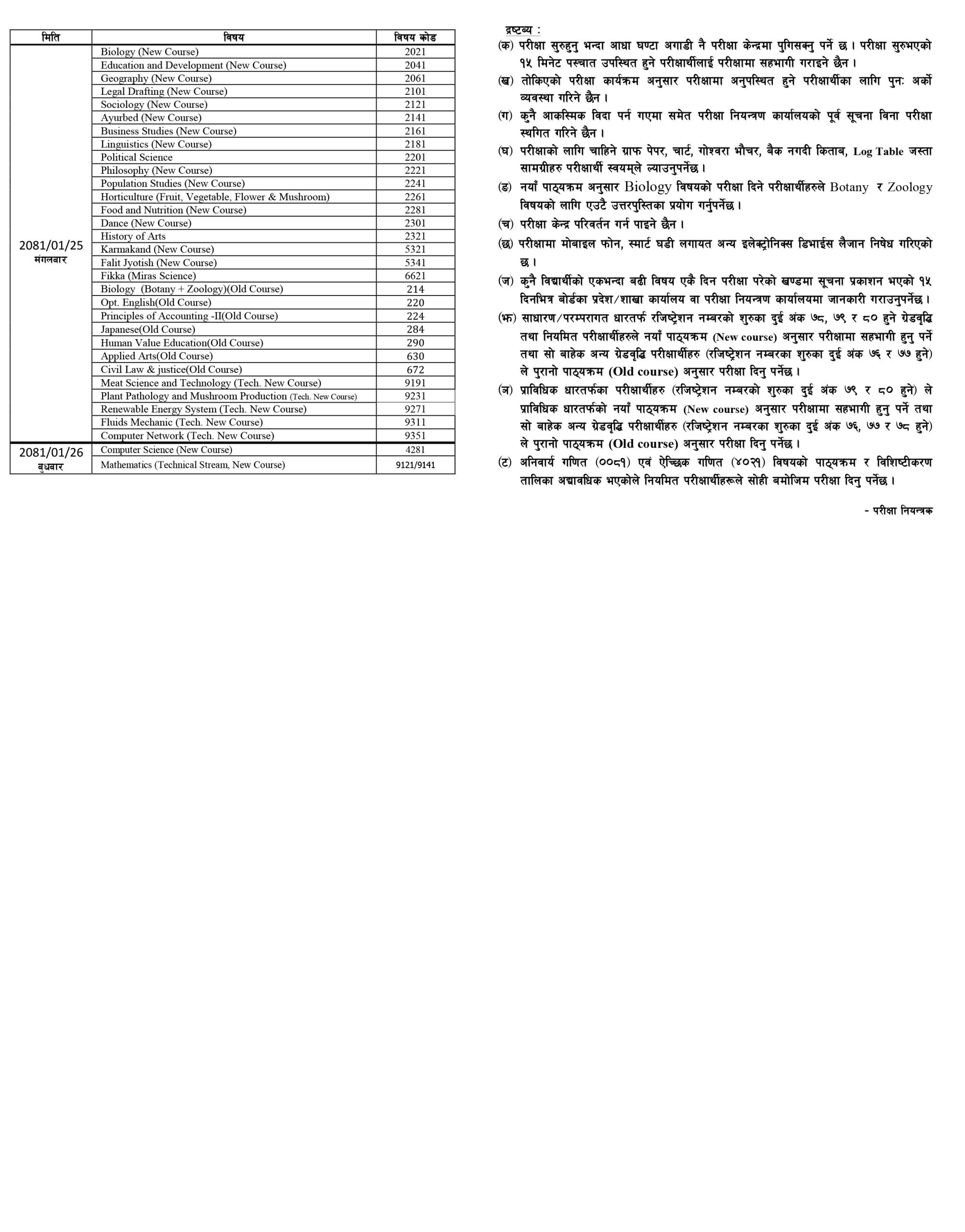 परीक्षा २०८१ वैशाख १४ गतेदेखि सुरु हुने छ र वैशाख २६ गते समाप्त हुनेछ ।