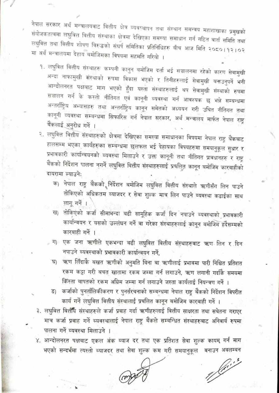लघुवित्तपीडित संघर्ष समिति र सरकारबीच शुक्रबार ६ बुँदे सहमति भएको छ ।