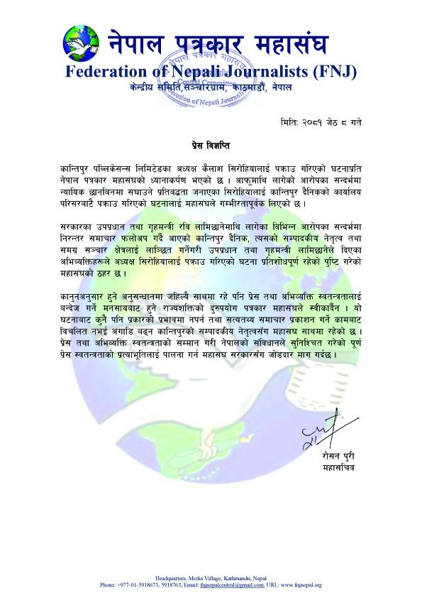 महासंघ महासचिव रोशन पुरीद्वारा जारी विज्ञप्तिमा सरकारका उपप्रधान तथा गृहमन्त्री रवि लामिछानेमाथि लागेका विभिन्न आरोपका सन्दर्भमा निरन्तर समाचार फलोअप गर्दै आएको कान्तिपुर दैनिक, त्यसको सम्पादकीय नेतृत्व तथा समग्र सञ्चार क्षेत्रलाई लाञ्छित गर्नेगरी उपप्रधान तथा गृहमन्त्री लामिछानेले दिएका अभिव्यक्तिहरूले अध्यक्ष सिरोहियालाई पक्राउ गरिएको घटना प्रतिशोधपूर्ण रहेको पुष्टि गरेको महासंघको ठहर भएको उल्लेख छ ।