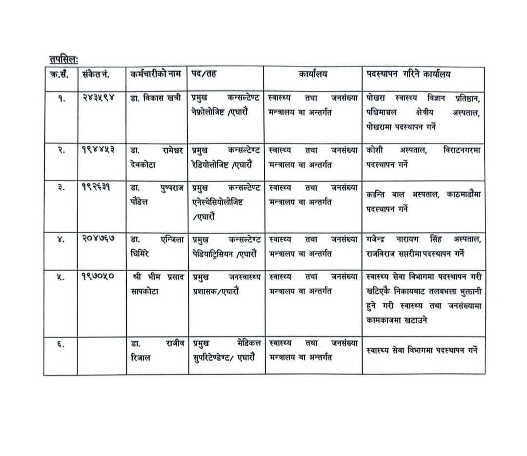 मन्त्रालयले ११ औं तहका ६ जना प्रमुख कन्सल्टेन्ट तथा मेडिकल सुपरिटेन्डेन्टहरुलाई मन्त्रालय अन्तर्गतका विभिन्न अस्पताल तथा विभागमा पदस्थापन गरेको हो।