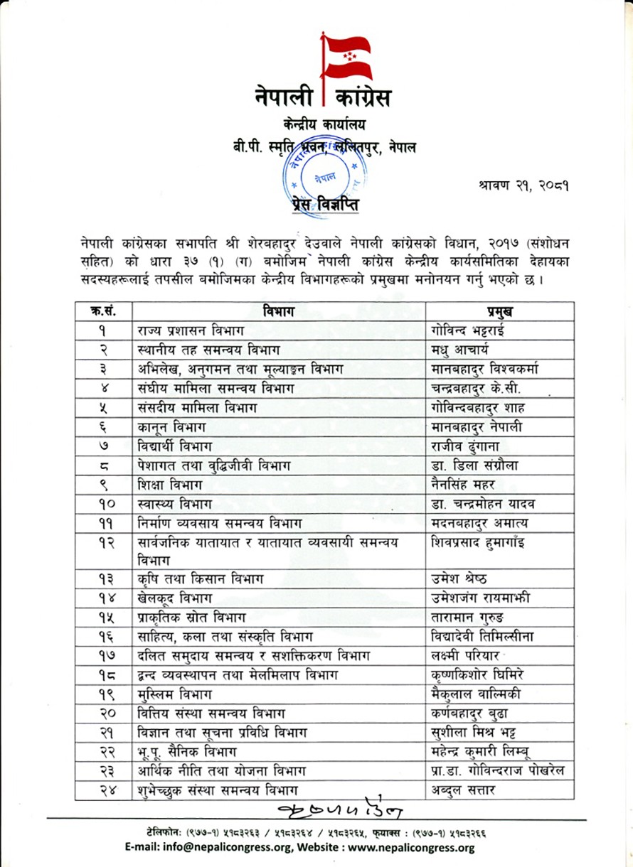 सोमबार सभापति देउवाले कांग्रेसको विधान, २०१७ (संशोधन सहित) को धारा ३७ (१) (ग) बमोजिम कांग्रेस केन्द्रीय कार्यसमितिका सदस्यहरूलाई केन्द्रीय विभागहरूको प्रमुखमा मनोनयन गर्नुभएको कांग्रेसका मुख्यसचिव कृष्णप्रसाद पौडेलले जानकारी दिनुभयो ।