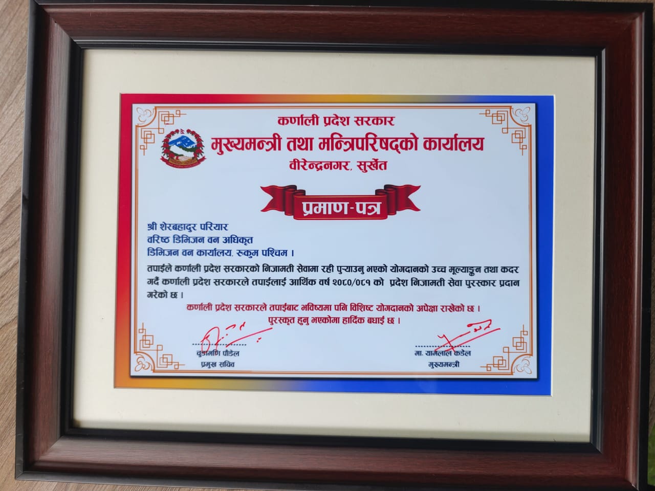मुसिकोट । कर्णाली प्रदेश सरकारको स्थापना दिवसको अवसरमा डिभिजन वन कार्यालय रुकुम पश्चिमका प्रमुख वरिष्ठ डिभिजन वन अधिकृत शेर बहादुर परियार पुरस्कृत हुनुभएको छ ।
