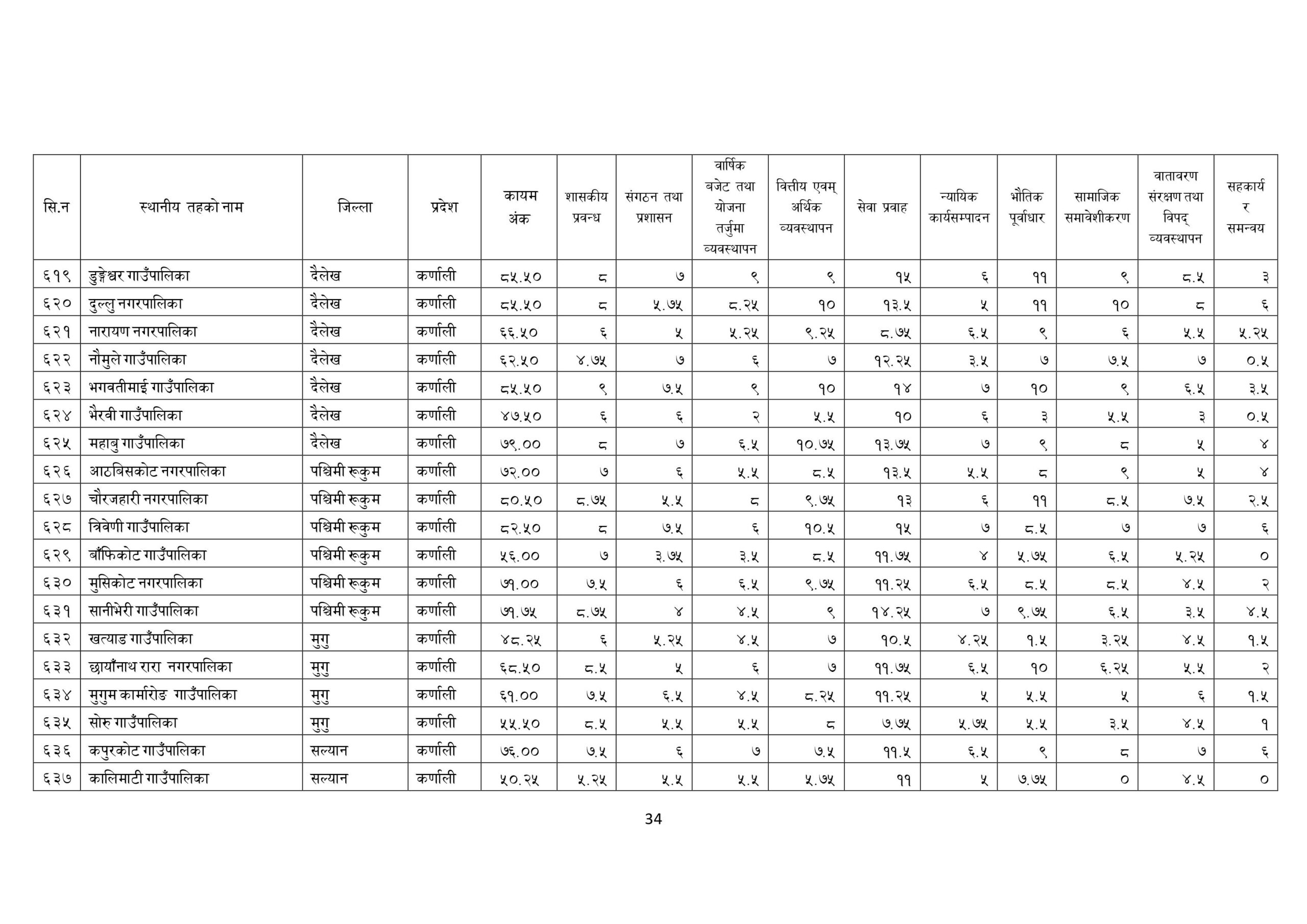 यसैगरि मुसिकोट नगरपालिकाले ७१ अंक र बाँफिकोट गाउँपालिकले ५६ अंक प्राप्त गरेका छन ।